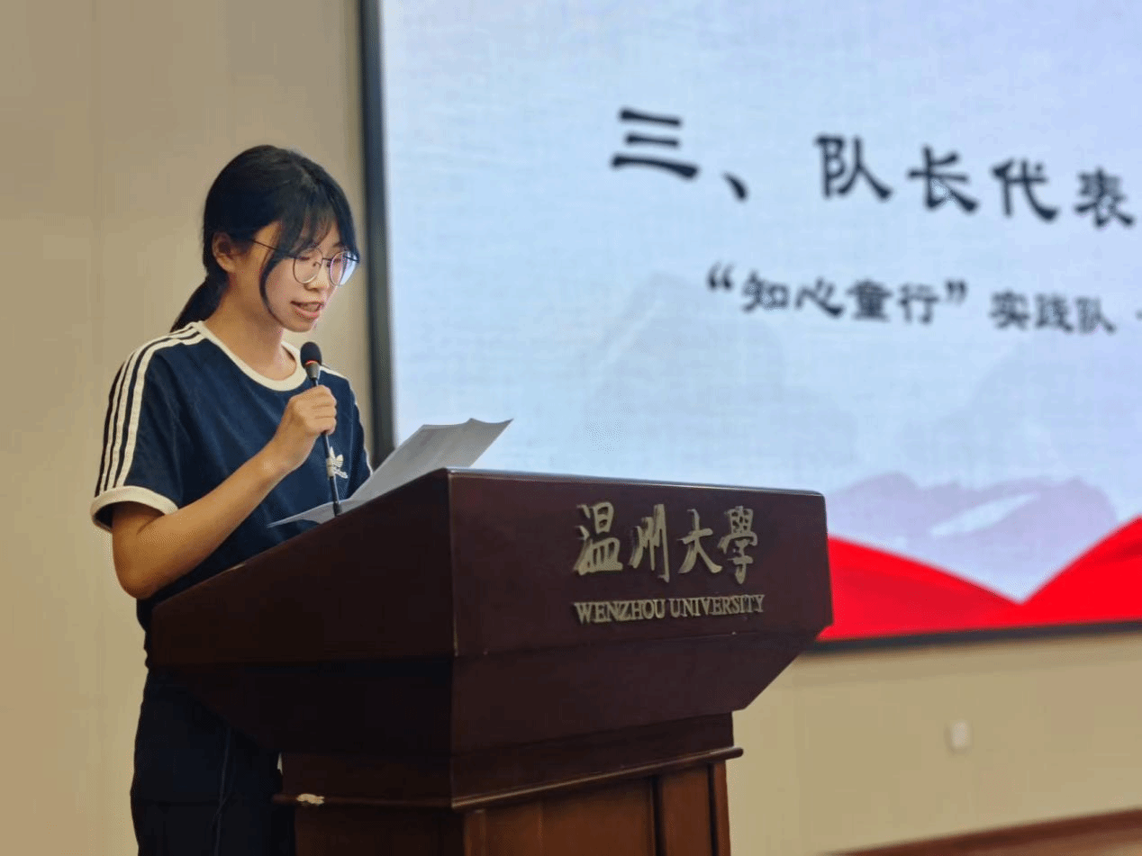 “知心童行”实践队代表金雪婷发言。她提出,本次暑期社会实践活动是连接理论与实际的桥梁,全体实践成员都要用蓬勃朝气感染身边的每一个人,在服务社会中践行初心!她也带领全体实践队队员宣誓,展现了泥巴影院 学子的昂扬热情与坚定信念。