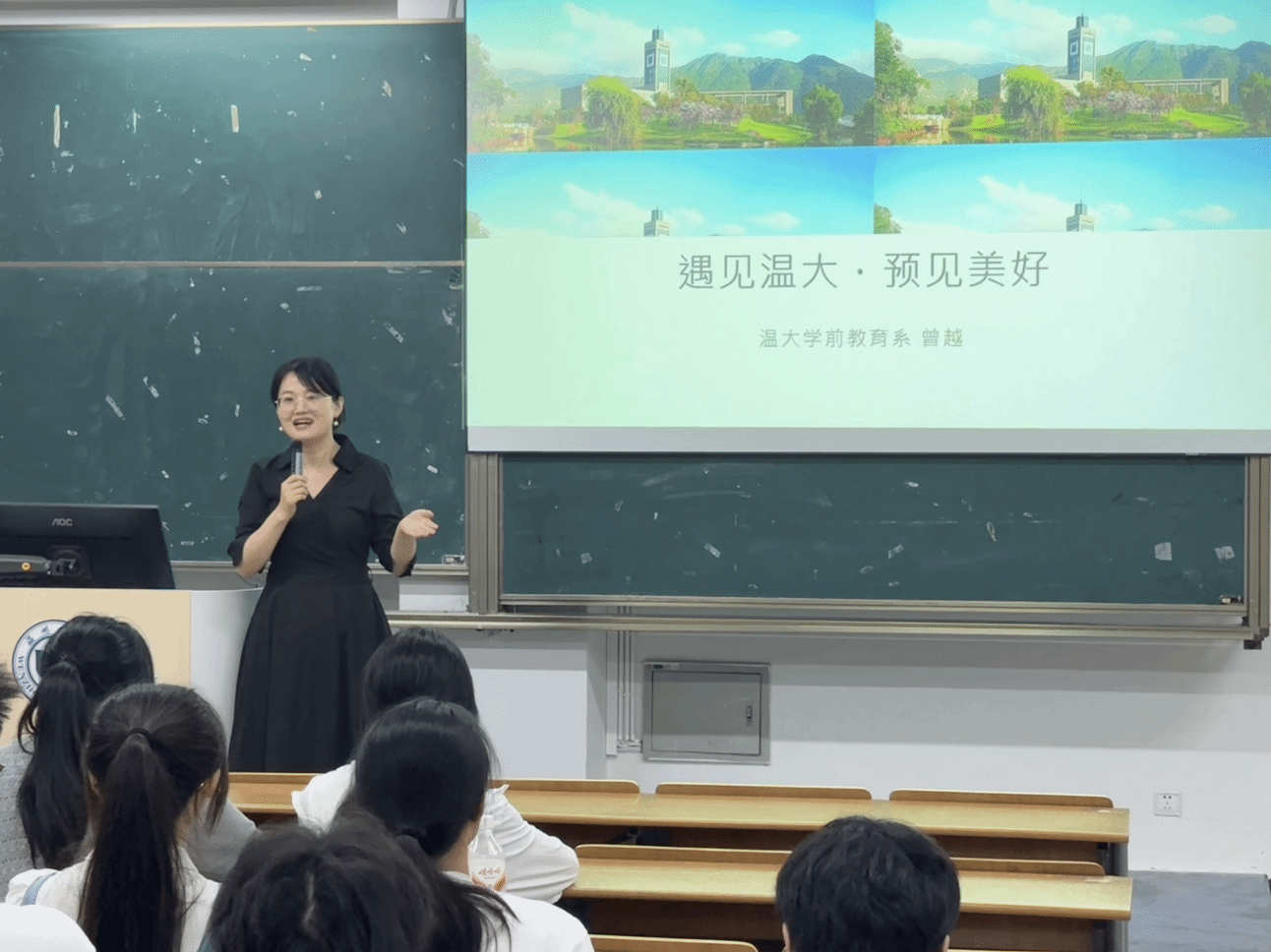 首先,学前教育系主任曾越老师介绍了泥巴影院概况 、专业发展以及专业特色,重点讲述了学前系理论实践相结合、实训基地和儿童剧等特色。