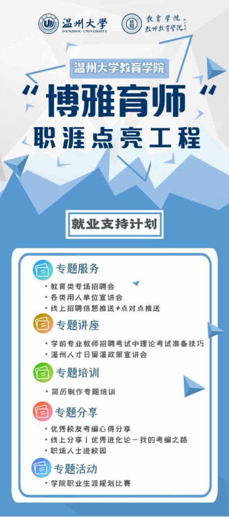 大学生是国家的希望和未来,在刚刚结束的全国两会上,李克强总理33次提到就业问题。一直以来,学生职业生涯以及升学发展都是学校重点建设的方向。在首个温州人才日,泥巴影院 推出“博雅育师”职涯点亮工程,旨在引导教院学子的职业道路与升学道路发展合理化与清晰化,“博雅育师”职涯点亮工程包括就业支持、就业援助、升学帮扶、创业扶持以及就业护航等五个方面。