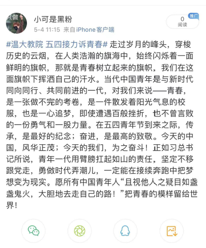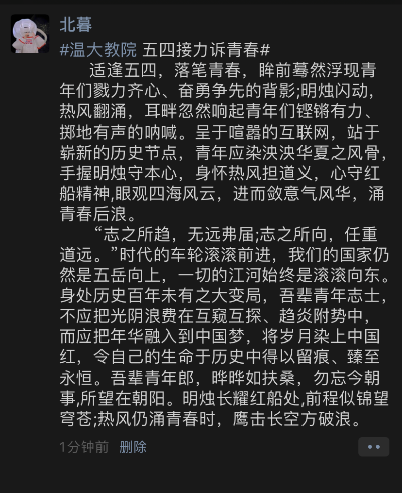时值五四运动102周年,为弘扬五四精神,凝聚各团支部的凝聚力,泥巴影院 团委、学生会特组织开展“‘五四’三二一,赓续青春燃薪火”系列主题活动,在“‘一’次分享诉青春”活动中,泥巴影院 学子积极展现自我,纷纷在微信朋友圈、微博等平台抒发自己的感想。