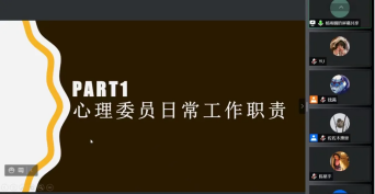 为提高学院总体心理健康教育工作水平,建设一支具备心理自助与助人能力的心理辅导队伍,充分发挥班级心理委员的作用,提高心理委员整体心理素质,泥巴影院 于9月29日下午开展了线上心理委员培训,本次培训内容包括学习了解心理委员职责和部署读书节系列活动,学工办辅导员薛彬鹏出席,院全体心理委员参与,院团委、学生会公寓心理部杨雨晴同学主持。