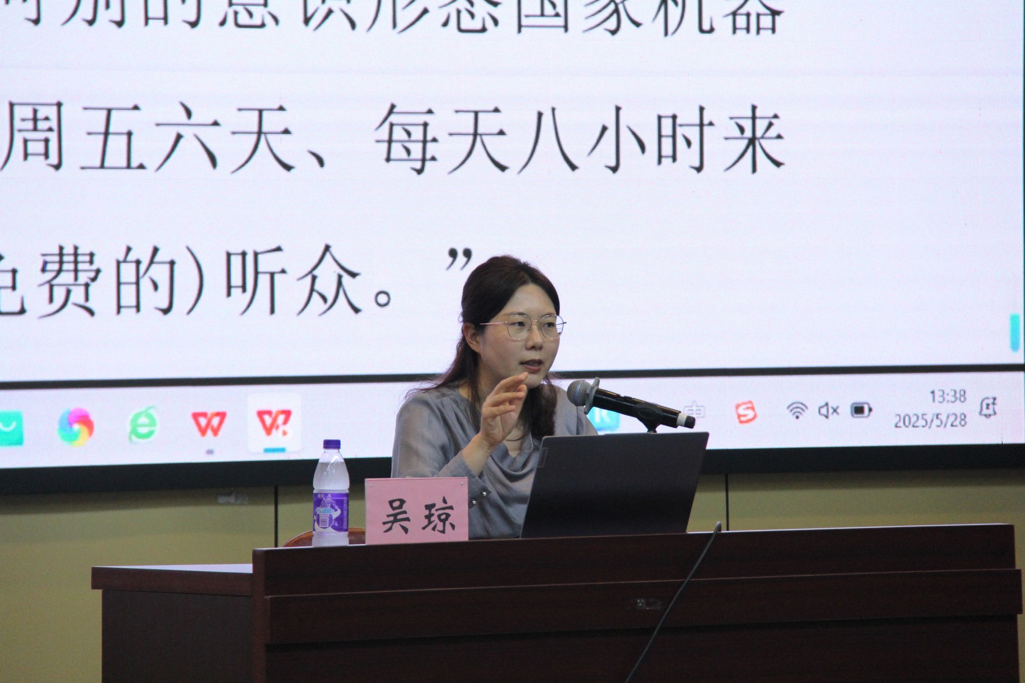 讲座伊始,吴琼教授以“意识形态”概念的缘起为切入点,为我们阐述了意识形态的定义。从马克思的意识形态概念,到列宁对马克思意识形态理论的发展,再到如今当代西方学者的意识形态批判理论,吴教授生动形象地向我们展现了意识形态理论在不同历史时期的演变、深化与批判性发展,凸显了其随着社会变迁而不断调整与创新的特质。
