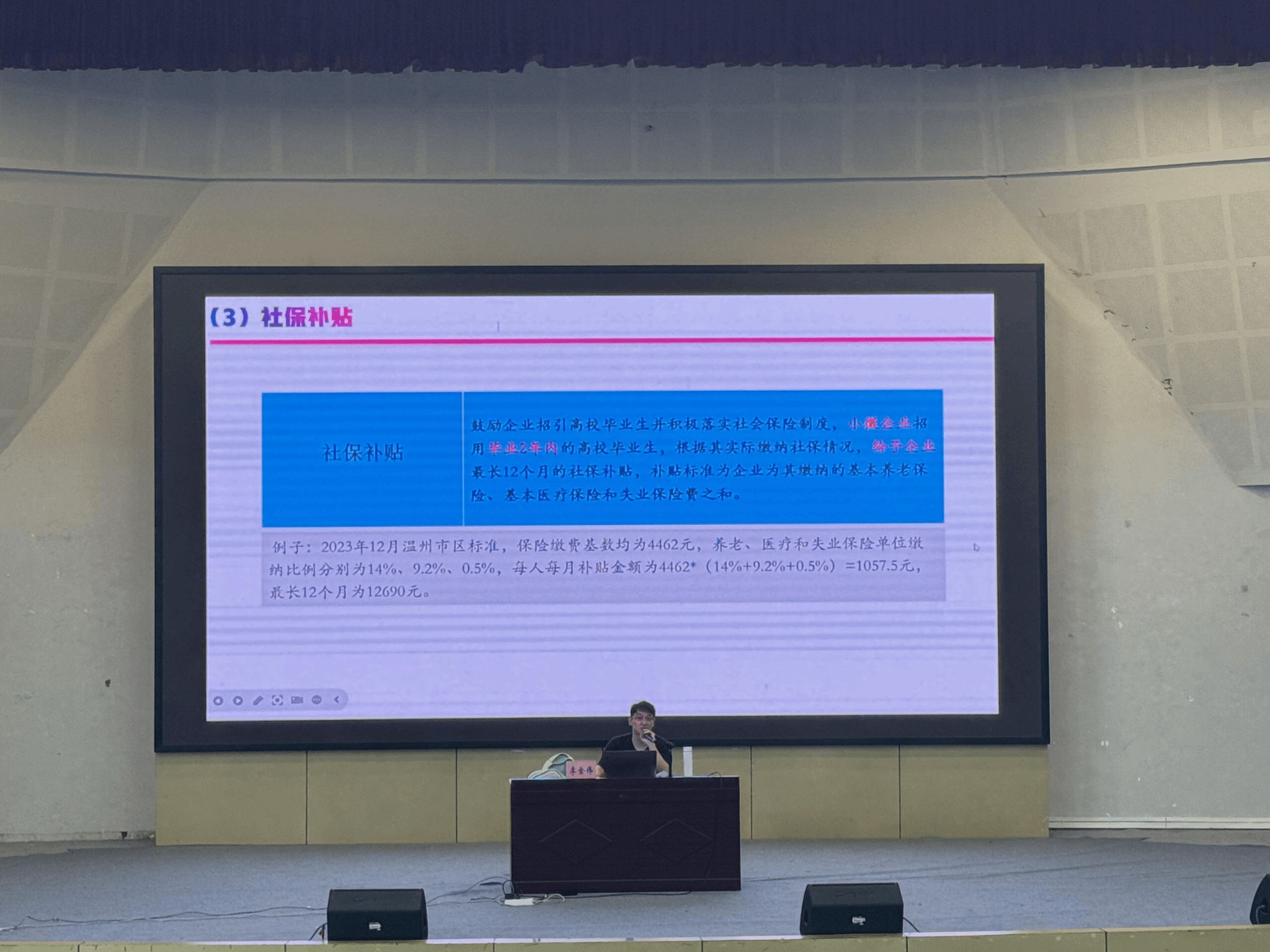 接着,李老师就温州出台的人才新政为学子进行详细解读。其中,温州为招引高校学生来温州创未来而推出的大学生专属政策“510行动计划”优势突出,该政策涵盖面广,包括住房、就业、交通、公积金、社保等多项补贴,为高校毕业生实习就业提供充分又全面的保障,从而加强当地人才吸引力,以此达到创新创业水平最大化提高的目的。