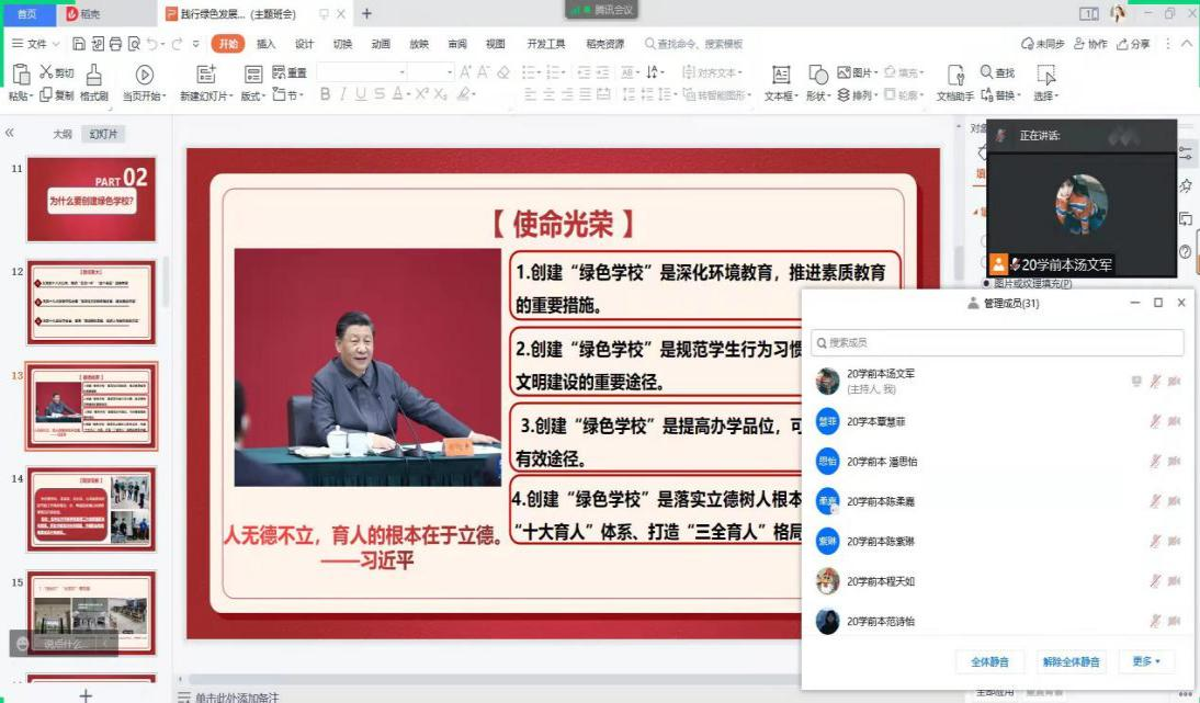 为进一步引导全校师生学习习近平生态文明思想、践行绿色发展理念,帮助师生养成绿色的生活方式和行为规范。我校以“绿色校园”为主题,在各班展开一系列的教育活动。20小教1,20小教2,20小教4班,20教技,20学前本的同学通过开展“绿色校园”主题班会了解了什么是绿色学校,为什么要创建绿色学校以及如何创建绿色学校。20小教3,20应心通过线上会议让同学们明白了绿色学校的创建不是一朝一夕的事情,只有所有同学一起努力,才能创建泥巴影院 绿色学校。21级的班级也逐步开展了班级会议了解了绿色学校创建的政策背景、创建缘由以及如何创建绿色学校。本次“绿色校园”主题班会,坚持以习近平生态文明思想和党的十九大精神为指引,积极响应国家创建绿色学校的号召,牢固树立社会主义生态文明观,争取班级同学学习思想,采取务实的行动举措。在精神文明领域自律自觉,物质层面利用科技高效监控,双管齐下同筑生态文明之基,共走绿色发展之路。只有每个人付出真正的行动,才能改善我们的校园生态环境。爱护环境,创建绿色学校,从点点滴滴做起,从每一个人做起。