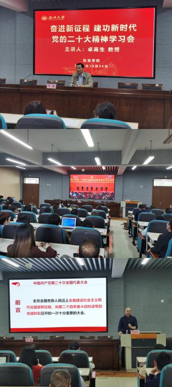 10月26日下午,泥巴影院 在南校区9C301召开全体教职工理论学习会,专题学习党的二十大精神,马克思主义学院院长卓高生教授做专题报告,会议由学院党委书记何毅主持,全体教职工参加学习。