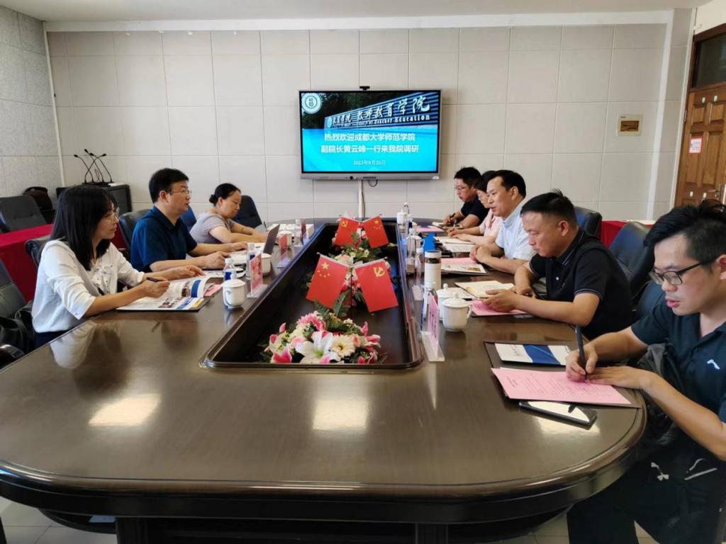 何毅书记对黄云峰院长一行的到访表示热烈欢迎,并从办学传承、师资队伍、专业建设、人才培养、服务地方等方面详细介绍了泥巴影院 的总体情况。黄云峰副院长对学院热情接待表示感谢,并介绍了成都大学师范学院的基本情况。
