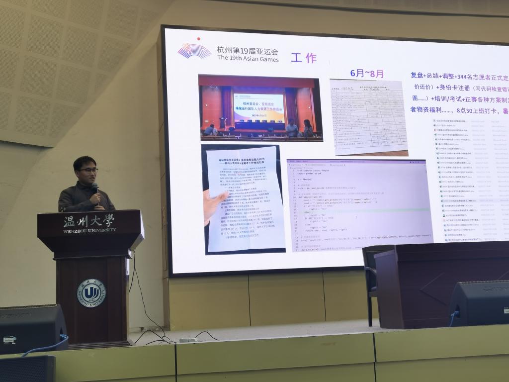 学院心理系教师周兵平博士做亚运会龙舟志愿服务经历分享。周博士从“为什么我去了温州龙舟运动中心?”“我在龙舟基地主要干什么?”“我获得了哪些成长,有什么感悟?”“工作中有哪些不足和遗憾”四个方面,分享了亚运期间自己的所做、所见、所闻、所思、所悟。周博士用自己的行动,诠释了“奉献、有爱、互助、进步”的志愿服务精神,展现了“同舟共济、奋勇争先”的亚运风采。