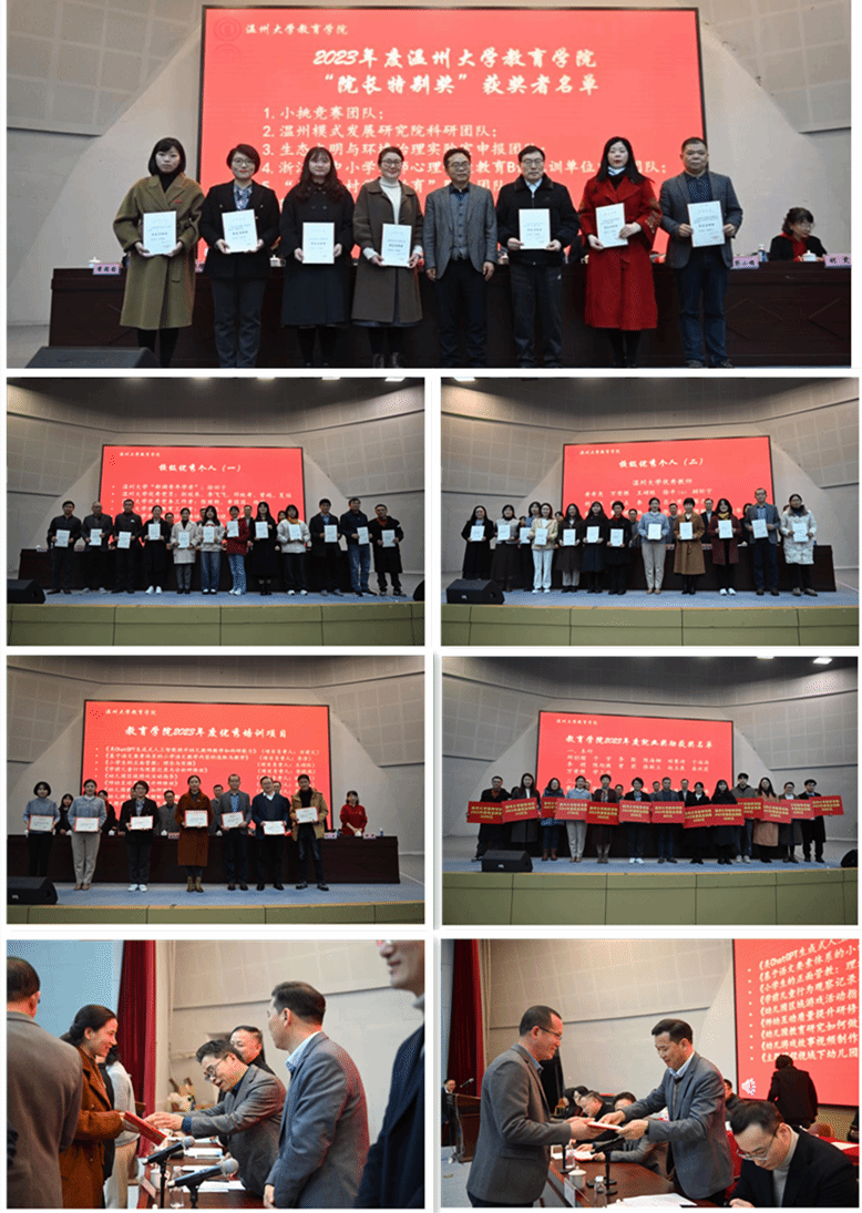 在欢快的音乐声中,学院领导为2023年度校“新湖青年学者”、优秀党员、优秀党务工作者、优秀教育工作者、优秀班主任、优秀教师、校工会优秀干部、校工会工作积极分子等校级荣誉获得者,以及学院“院长特别奖”获得者、院工会活动积极分子、就业奖励获得者、优秀培训项目主持人等院级荣誉获得者进行表彰。大会还对学院2023年度在课程建设、教学科研、人才培养等方面取得优异成绩的教师和相关业绩进行了展示。