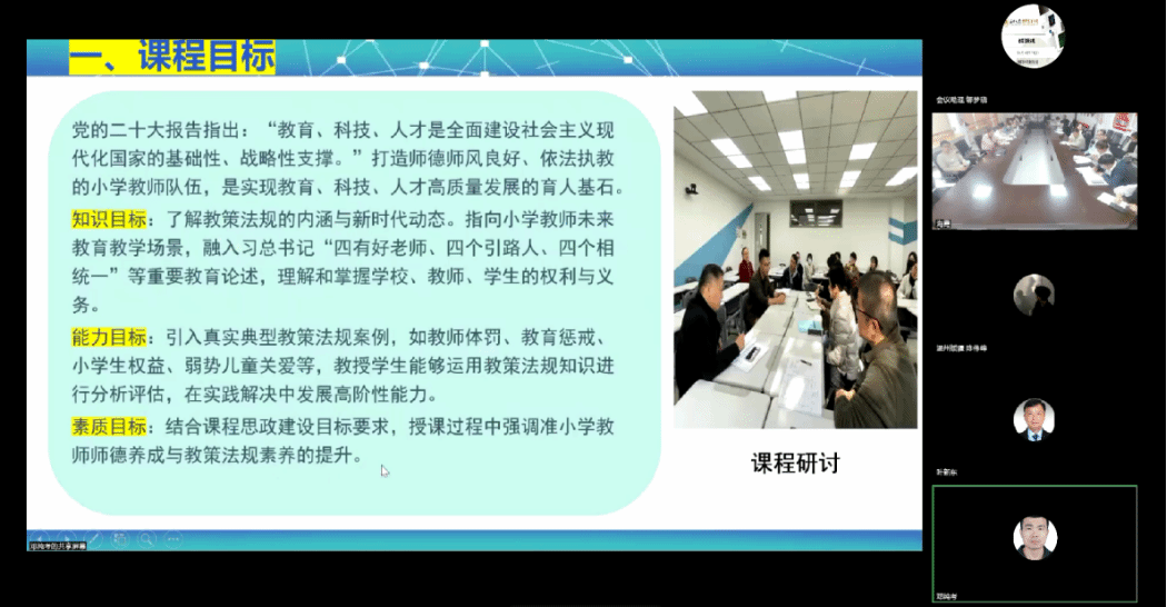 小学教育系主任邓纯考教授分享了其在省一流线上线下混合式课程《小学教育政策与法规》课程建设方面的一些经验,他围绕《小学教育政策与法规》建设,从课程目标、课程建设与应用以及课程成绩评定等三个方面展开经验分享,为建设课程的相关教师提供“他山之石”。来自阿克苏泥巴影院 的乔艳老师今年刚刚接手该课程,与邓老师围绕该课程进行了深入讨论。