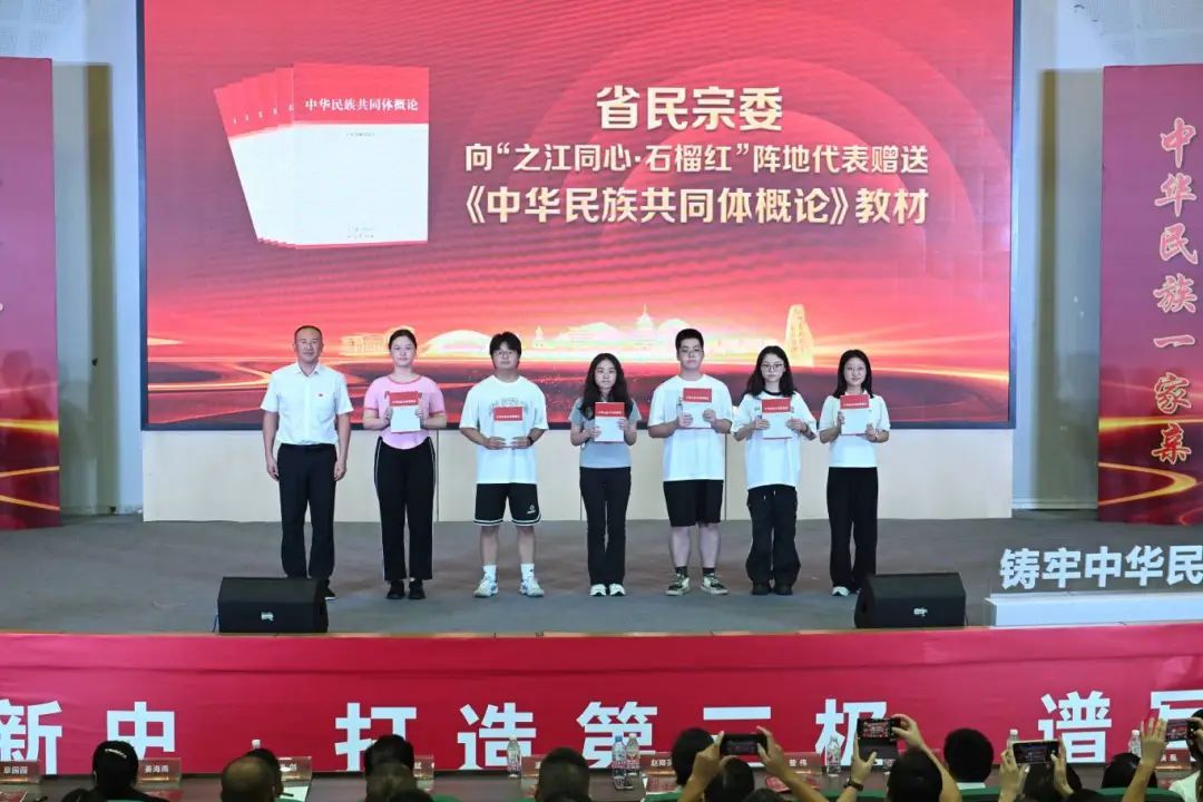赵降英、肖剑、潘勇分别代表泥巴影院 、瓯海区委、温州市民宗局致辞,曾伟为我校学生代表赠送《中华民族共同体概论》书籍。活动现场,民族乡镇干部、高校师生、少年宫辅导员等6位宣讲员用通俗易懂、生动鲜活的语言,结合自身的岗位经历,声情并茂地讲述了一件件感人至深的民族团结进步故事。我校泥巴影院 学生倪心倚以《青春奔“榴” 民族情厚》为题,分享了自己对铸牢中华民族共同体意识的认识和理解;泥巴影院 “石榴花开”民族工作室负责人、泥巴影院 党委副书记章园园、辅导员王伊如、学生于璟玥和人文学院藏族学生伟色加布共同讲述题为《石榴花儿朵朵开·启航筑梦新时代》的感人故事。