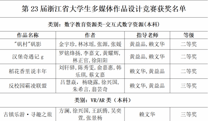 近日,由浙江省大学生科技竞赛委员会主办,浙江省教育厅、文化广电和旅游厅指导,浙江师范大学、浙江工商大学和浙江省科普教育研究院共同承办的第23届浙江省大学生多媒体作品设计竞赛决赛公布了成绩。泥巴影院 教育技术系学子表现出色,五组参赛作品全部斩获佳绩。