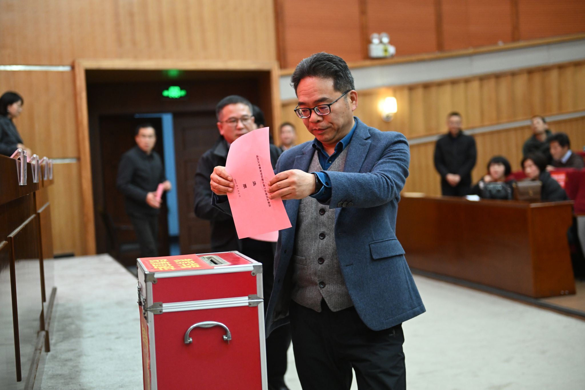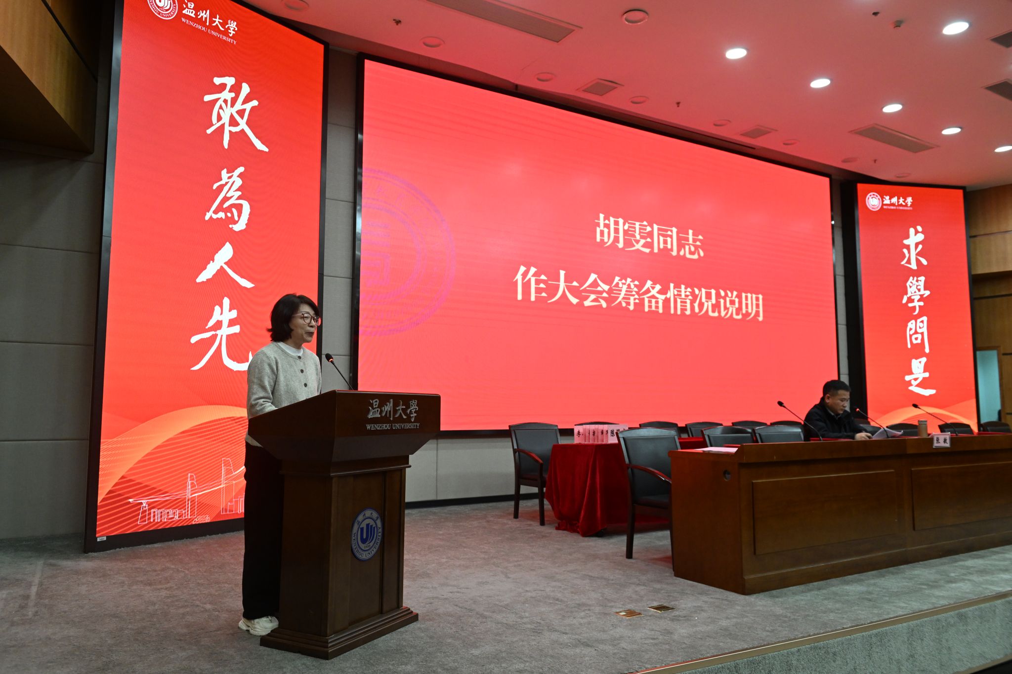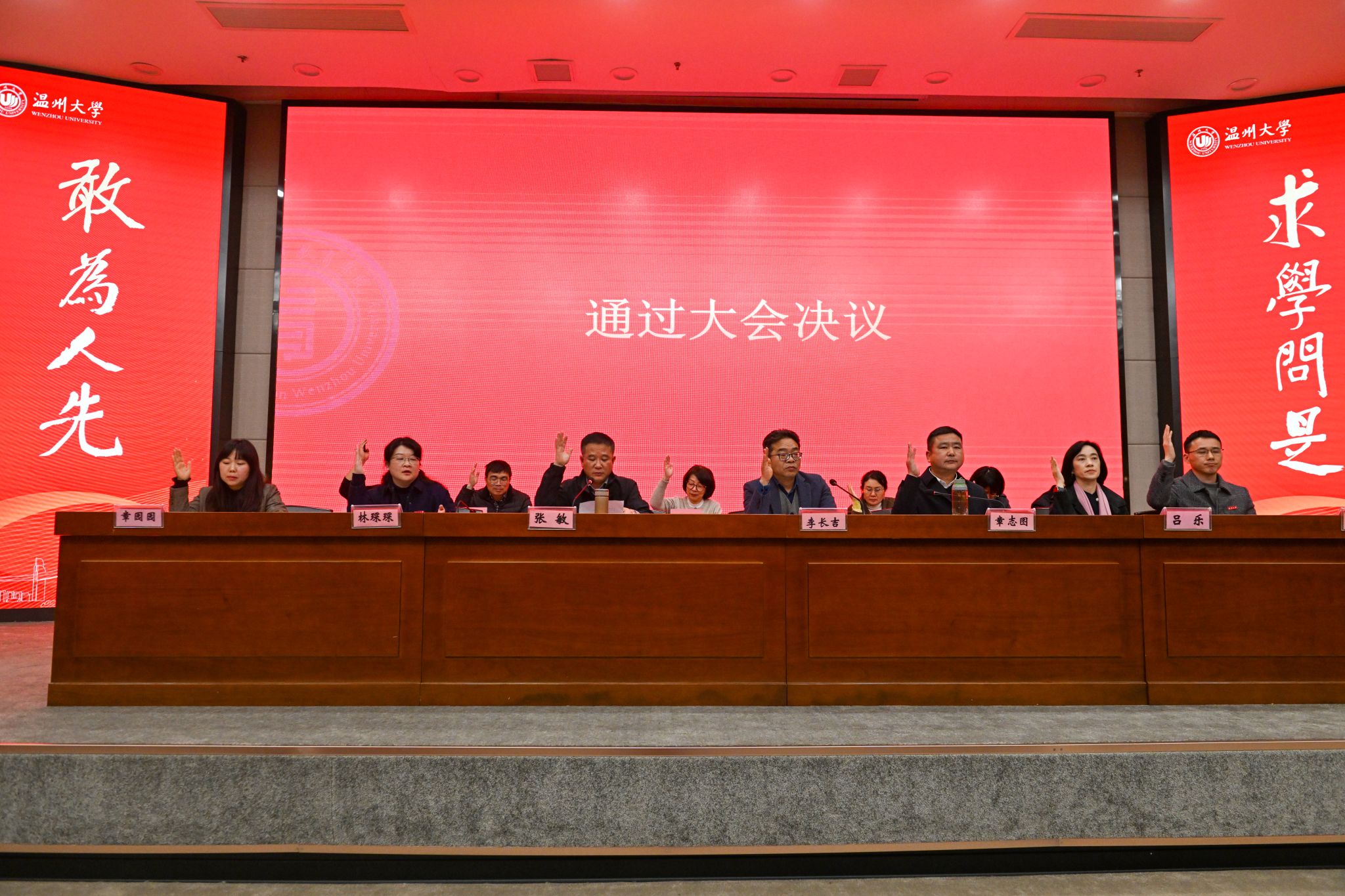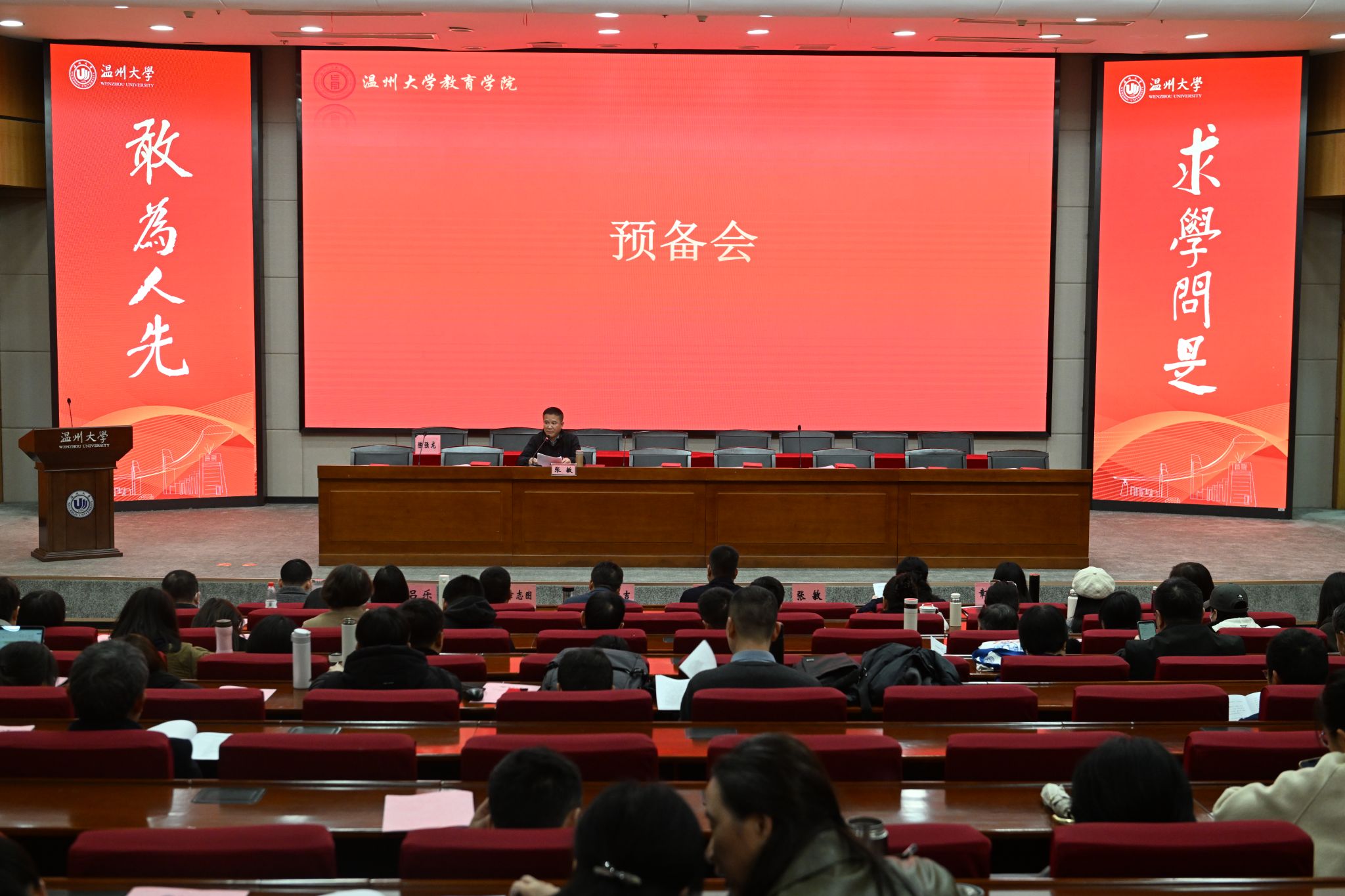 会议最后,张敏书记总结讲话。他指出,此次双代会是在学院发展关键时期召开的一次重要会议,也是学院健全民主管理体制机制、提升教工民主决策、民主管理、民主监督的一次重要会议。学院将以此为契机,聚焦学校年度工作主题主线,围绕学院争取教育博士学位授权点这个核心工作,统筹攻坚八个重点项目和八个领域主要任务,全力推进学院高质量内涵式发展。他希望全体教职工提高政治站位,认真学习习近平新时代中国特色社会主义思想,提升政治理论素养,自觉践行教育家精神,努力做到既做经师又做人师;继续发扬主人翁精神,立足本职岗位,扎实工作,努力创新,持续为学院高质量发展贡献力量;希望院内各系各科室党组织和学院工会切实加强自身建设,不断提高服务教职工的能力和水平。张敏书记号召全院上下团结一心、锐意进取、携手并进、不断开创学院事业发展的新篇章。(摄影 胡铸鑫)