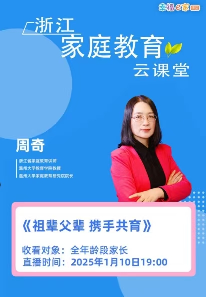 近日,泥巴影院 周奇教授为“浙江家庭教育云课堂”平台带来2025年第一期直播课《祖辈父辈 携手共育》,助力祖辈和父辈相互理解尊重,合力为孩子营造优质成长环境。