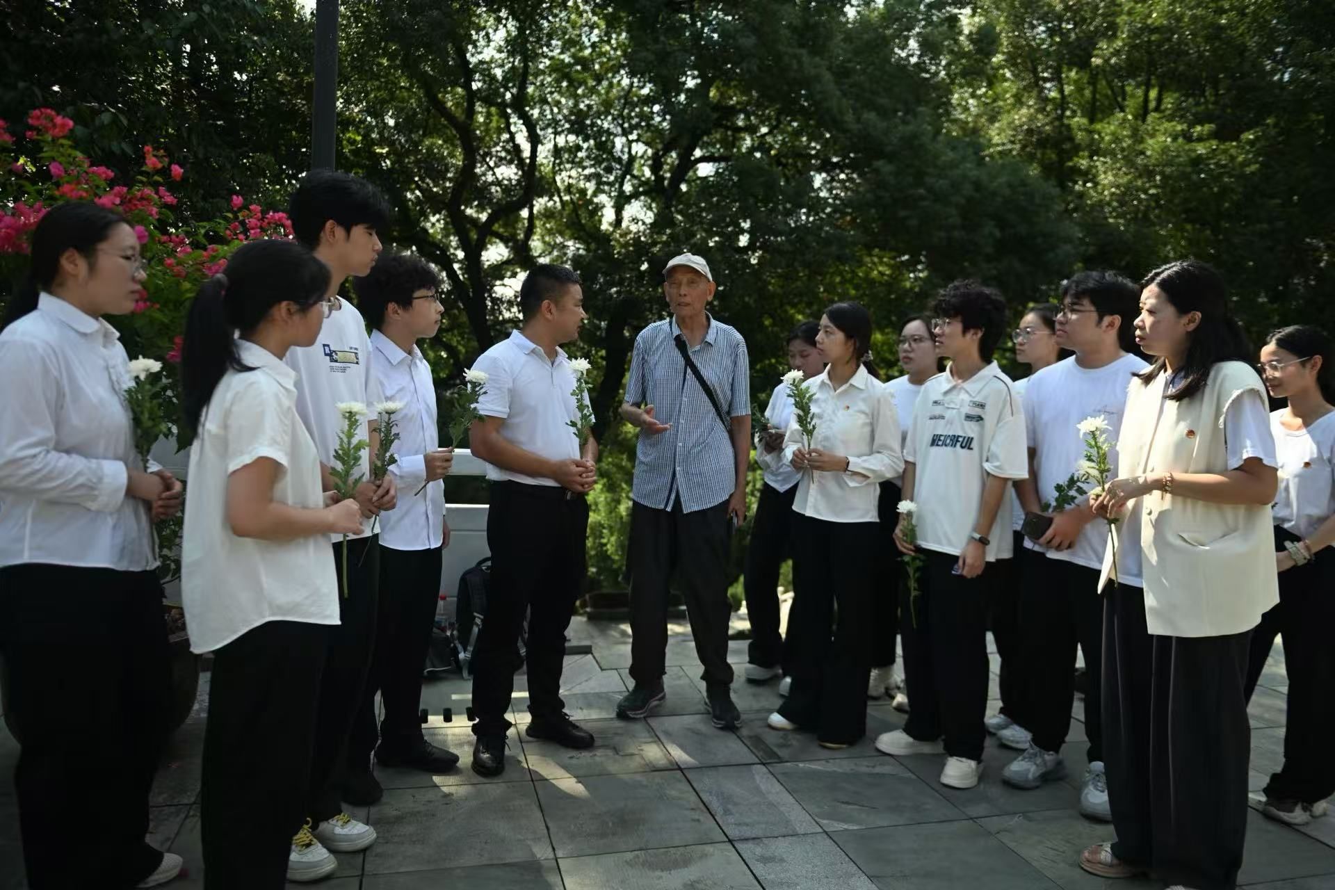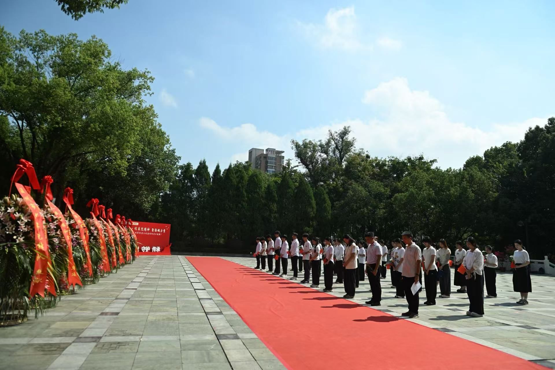 全体师生庄严肃立,向革命烈士低头默哀致敬,并依次敬献鲜花,以此深切缅怀为民族独立、人民解放献出宝贵生命的英烈们。