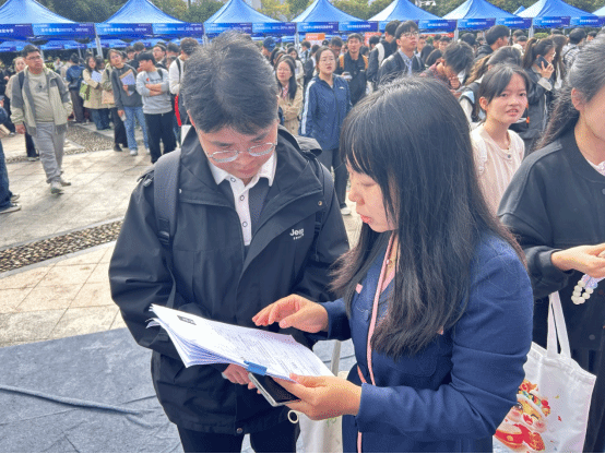 "投了几家单位?""简历突出教学实践了吗?""别因暂时没回应而焦虑",领导们与毕业生亲切交流,针对简历优化、面试准备、岗位选择等给予具体指导,帮助学生明确方向。现场毕业生表示,院领导指导"很接地气",解决了求职需求。志愿者也感受到学院关怀,表示会认真站好每一班岗。