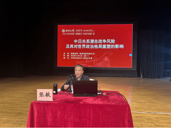 2025年12月1日晚,泥巴影院 2025-2026学年第一学期第四次《形势与政策》专题课程在育英大礼堂举行。学院党委书记张敏老师以“中日关系潜在战争风险及其对世界政治格局重塑的影响”为主题,结合历史与现实、军事与政治、局部与全局,系统剖析中日关系复杂性,引导青年学子理性看待大国博弈,厚植家国情怀。学院党委副书记兼纪委书记章志图主持课程。