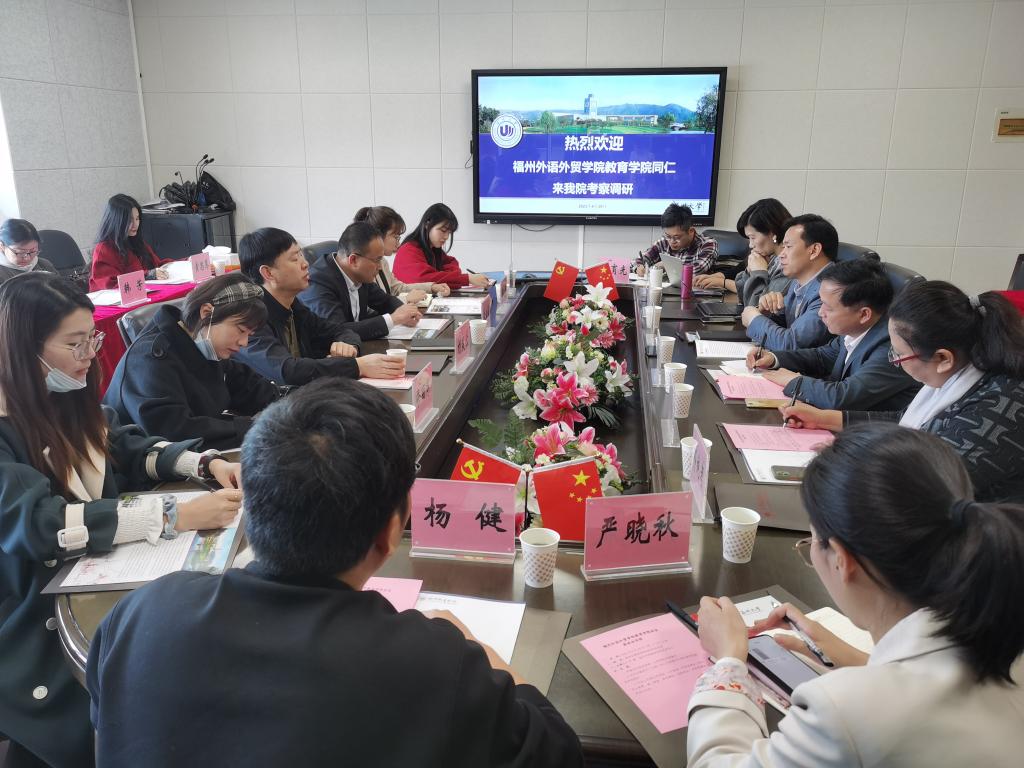 2021年4月19日上午,福州外语外贸学院泥巴影院 院长刘炎欣、党委书记林业铖一行10人来泥巴影院 调研交流。学院党委书记何毅、副院长叶新东、副书记彭小媚出席接待,小教系、学前系、学工办、实验中心相关负责人和老师参加座谈。