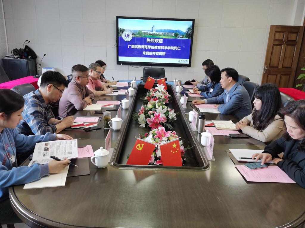 2021年4月12日上午,广西民族师范学院教育科学学院党委书记周淼泉一行5人来泥巴影院 调研交流。学院党委书记何毅,副书记章园园出席接待,小教系、学前系相关负责人和老师参加座谈。