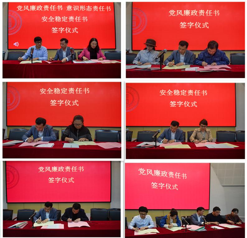 何毅书记首先代表学院与各科室、系(中心)负责人一对一签订了党风廉政建设、意识形态工作和创建“平安校园”目标责任书。