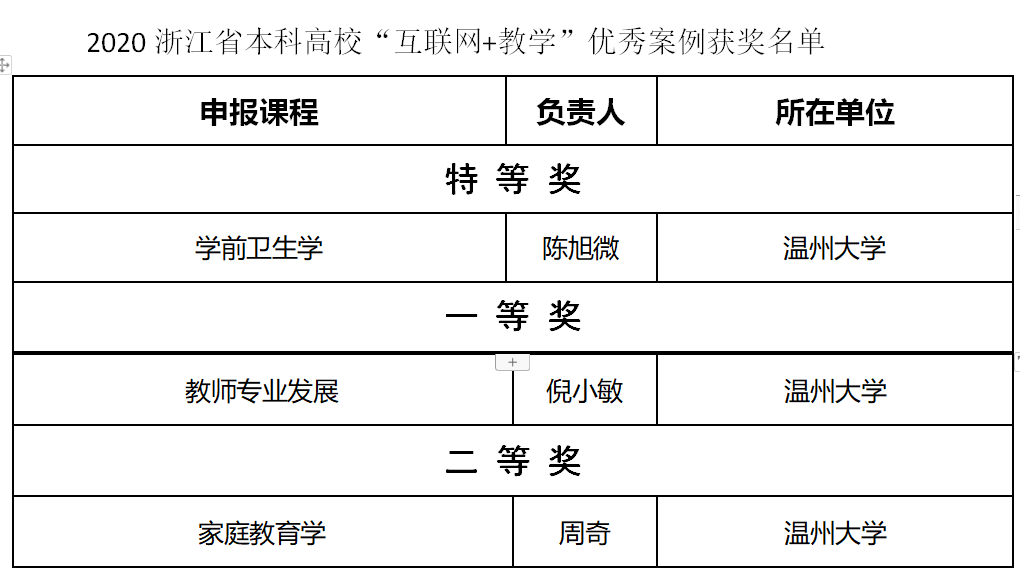 近日,浙江省高等教育学会公布了2020浙江省本科高校“互联网+教学”优秀案例获奖名单,泥巴影院 3门课程案例获奖,分别是陈旭微教授《学前卫生学》、倪小敏教授《教师专业发展》、周奇教授《家庭教育学》。