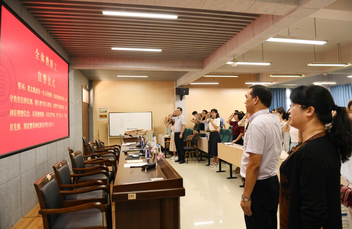 首先进行隆重而热烈的新教师入职仪式。何书记为新入职的6位教师颁发入职纪念证书、师德承诺书以及师德师风建设制度摘要等材料,新教师们怀着激动的心情走上主席台,何书记为新教师一一颁发泥巴影院 入职“三件套”并合影留念。各系负责人为新教师佩戴校徽,并送上鲜花,表达对新入职老师的热烈欢迎和殷切期望。入职仪式后,全体教师起立,举起右手,进行教师宣誓仪式。作为教育工作者,每年在教师节前夕举行全体教师宣誓是学院师德建设的传统,提醒全体教师时刻不忘立德树人初心,牢记为党育人、为国育才的使命。