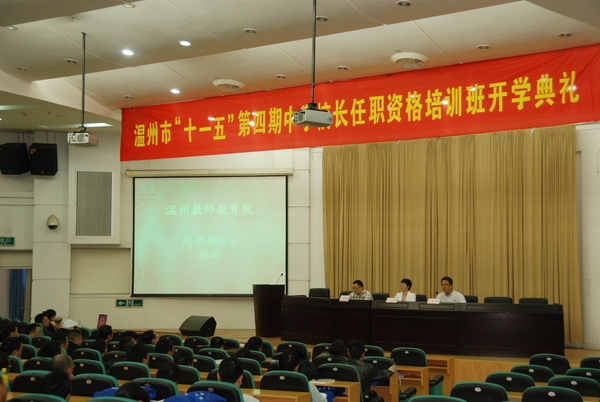11月10日下午,温州市“十一五”第四期中学校长任职资格培训班开学典礼在学院路校区信息楼报告厅隆重举行。林娟娟副校长,温州市教师教育院周平珊院长,泥巴影院