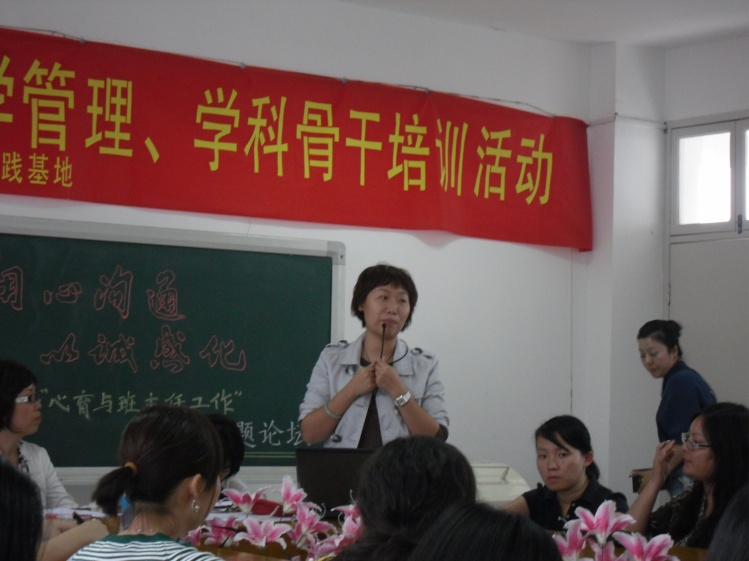 活动的开头,张婕老师的一席话就赢得的满堂彩。她说:现在班主任的角色和传统的班主任角色是不同的,新时代的班主任除了班级管理和教学任务外,还要充当心理辅导师的角色。她结合自身当班主任和心理辅导员的双重身份,以自己所辅导的学生为例对如何与问题学生进行沟通作出了精辟的见解。她将其主要概括为两点:会说和会听。会说并非指教师要能说会道、口若悬河、滔滔不绝而是指要说之有用。举个班主任最常遇到的问题的事件为例——学生打架。一般的班主任开口问的第一句话是“为什么打架?”典型的责备口气,高高在上的教育者姿态。对于视打架为家常便饭的问题学生会好好和你沟通吗?假如你换一种问法“你能和老师说说什么原因让你想揍那个家伙?”把自己作为平等对话中的首席,这是学生就会觉得自己与老师是平等地位的,他的话匣子就打开了。会听,用张婕老师的话说是指把自己当做一个桶子,让学生把苦闷烦恼都倒到她那个桶子里,然后她再去吸收消化后给学生适当的指导。其次,张婕老师指出在与学生沟通前要先了解学生的气质类型,人的气质类型主要分为四种即:多血质、胆汁质、粘液质,对于如何与胆汁质学生沟通张婕老师进行了详细的指导。 胆汁质的人易急噪、暴躁和焦躁,行事鲁莽,易因小事而大发脾气,产生对立情绪,萌生报复心理,办事不考虑后果,事后又后悔,但“虚心接受,坚决不改”。在遇到不如意时,甚至会欺负无辜来发泄不满。对于这类学生,与他们的沟通主要可以概括为三个字“绕指柔”,就跟打太极一样,要以柔克刚。要给与他们充分的关心,要“与狼共舞”。比如张婕老师会和后进生进行每周一谈,谈话内容并非是要给他们灌输大道理而只是要让学生明白有人在关心他,这样的谈话每次只需花15分钟到半个小时,这期间让学生充分感受你是属于他的,他可以信任地和你谈任何事情。
