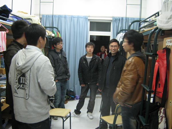 3月2日晚上,继续学院各班主任、辅导员下寝室看望学生后,学院全体党政领导在辅导员的陪同下再次到学生宿舍看望学生,了解学生的假期生活和到校后的精神面貌,听取学生对学院建设的看法和建议。胡来林、胡伟国、潘玉进、张宝臣、郑信军、孙芙蓉、嵇小怡等学院领导对学生宿舍的文明卫生状况,对学生的学风表现情况,以及对学生的精神面貌表现给予了肯定,并希望同学们能快速从假期生活状态转变到紧张有序的校园生活状态。