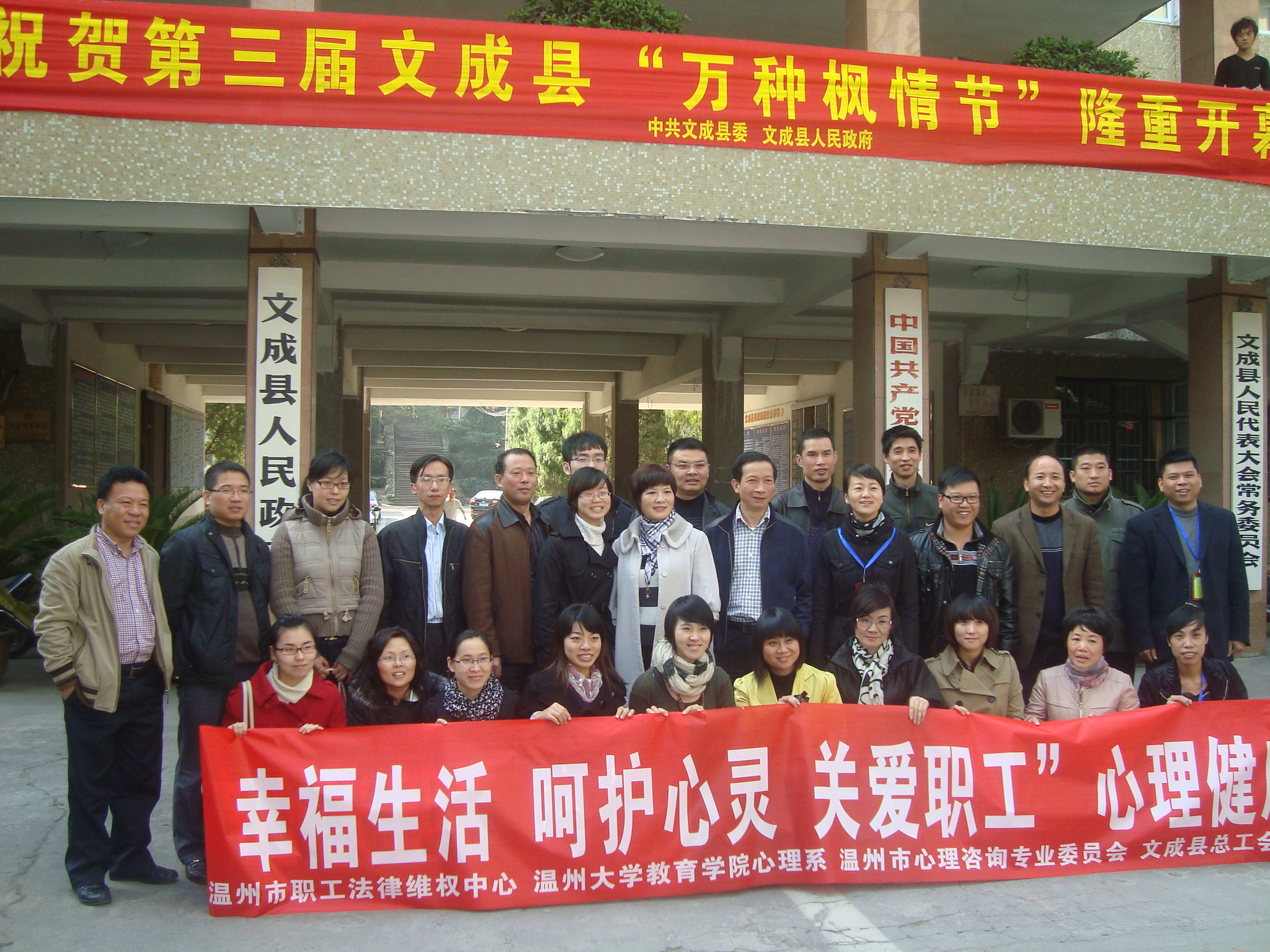 11月27日,泥巴影院 心理学系与温州市职工法律维权中心、温州市心理咨询专业委员会,在文成县联合开展心理健康系列活动。市总工会、文成县总工会有关领导,市心理咨询专业委员会负责人及泥巴影院 心理系盛建森老师参加了活动。