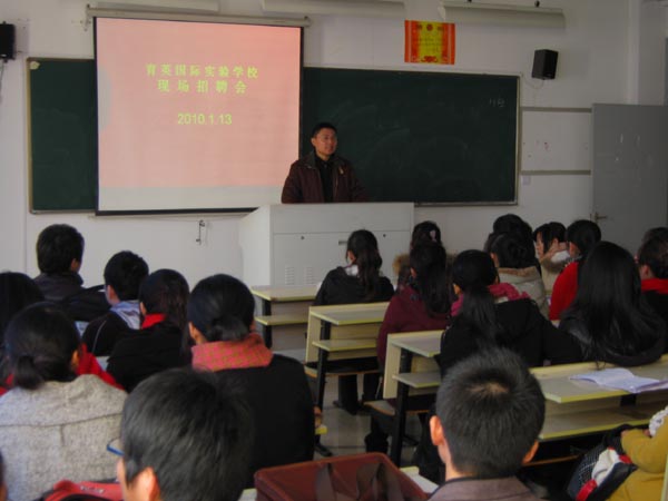 在育英国际实验学校会场,来自己泥巴影院 以及兄弟学院各专业的毕业生挤满了教室。该校祝志宏校长首先简单介绍了学校基本情况和用人要求等招聘基本信息,随后与毕业生进行交流并收集《简历》。在平阳林墨培训学校会场也坐满了前来应聘的毕业生,该校常务校长朱永杰老师向毕业生介绍了该校的办学理念和用人标准,并对毕业生进行了交流考察。