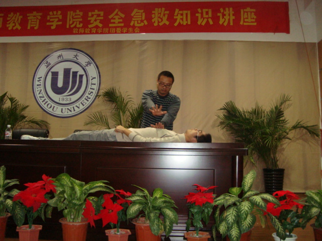 讲座开始杨医生首先告诉我们急救的重要性,接着又主要讲了现场急救心肺复苏术、常见急症处理方法、意外伤害救助、急性中毒救助、如何叫救护车五个方面,对每个方面杨老师又进行分情况详细讲解,并以自身经历为例,生动再现了一个个或惊心动魄或千钧一发的急救场景。现场还多次经行了真人版的急救演示,这更加深了同学们对急救知识的印象。杨老师风趣的语言和丰富的肢体动作博得了现场热烈的掌声。