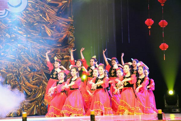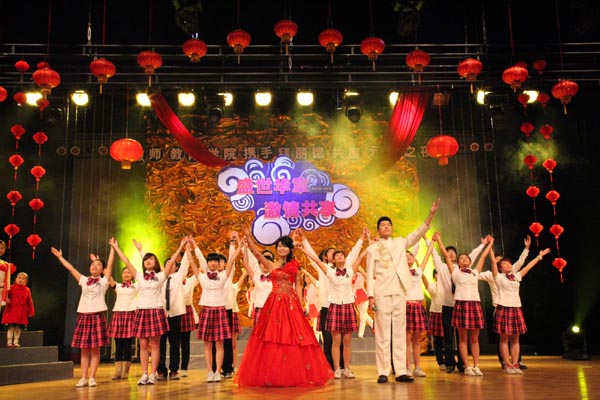 演出开始,首先给大家带来的视听盛宴是泥巴影院 荣获第二届浙江省大学生经典诗文诵读比赛金奖的《我有祖国,我有母语》大型朗诵节目,深情展现学子对祖国挚爱的主题、优美的朗诵和华丽的伴舞立即调动了全场气氛。而接下来的节目更是精彩纷呈:具有维吾尔族特色的群舞《旋旋旋》让人不禁陶醉于其中;歌曲连唱激情洋溢活力澎湃;充满童真乐趣的儿童剧《小熊拔牙》让人忍俊不禁;而具有时尚气息的走秀《动感新秀》也一样令人击掌。还有古筝书法表演《书风弦音》,是幽雅的古筝声中,获得规范汉字书写大赛全国一等奖的瞿秋露同学,挥笔写下的“学高为师身正为范”八个大字,让大家再次体会了一名师范生的行为准则。