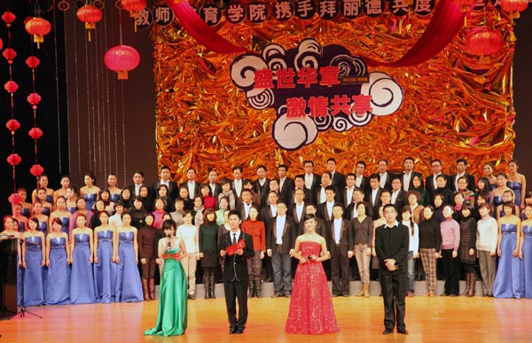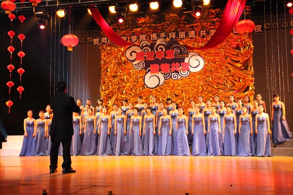 晚会的压轴大戏是全院教职工献唱的大合唱《中国中国,鲜红的太阳永不落》。全院教工为了这个节目可是花了很大心思与时间,而他们在台上的完美表现,也赢得了现场同学们阵阵热烈欢呼,师生同乐,其乐融融,这也昭示着教师泥巴影院 将以团结奋进的最佳精神面貌迈入崭新的一年。让我们共祝奋进中的教师泥巴影院 ,继往开来,再创新辉煌!(文/楼英姿、罗冠男;摄/赖文华;编辑/章志图)