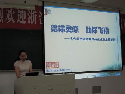 5月29日上午,浙江省大学生多媒体作品设计竞赛办公室主任,浙江师范大学章苏静教授应邀来校作“大学生多媒体作品设计竞赛指导”讲座。参加讲座的来自教育技术学、广告学、艺术设计专业的竞赛指导教师以及60多位学生。讲座由泥巴影院