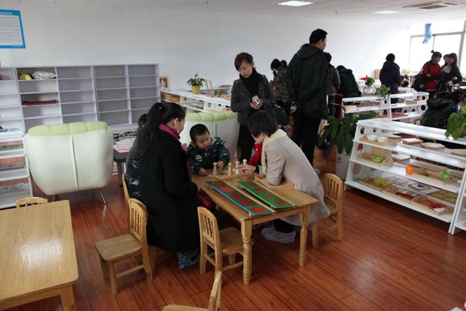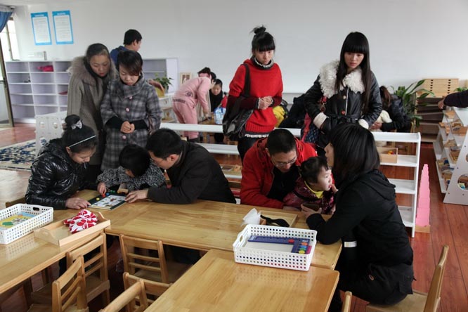学前教育系五年一贯制的6名大二学生辅助指导。孩子们被这些精心设计的教具和学具所吸引,兴趣很高,家长们也反映这样的活动非常有意义,很多家长还就孩子的教育问题和戴老师进行了交流。下午也有10多名孩子进行了体验,同样取得了非常好的效果。