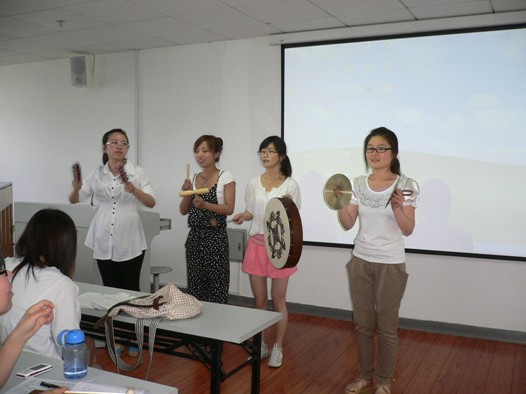 08学前本全体同学同学在任课老师林炎琴的指导下进行了一场别开生面的打击乐演奏会。这是一堂学前儿童艺术教育实操练习课,同学们以寝室为单位,自行选择乐曲、编配乐器、设计节奏型并进行演奏。三角铁、铃鼓、双响梆子…只见同学们将演奏乐谱贴到黑板上,手拿各类乐器,合着拍子专心致志地演奏起来,奥尔夫音乐实验教室里传来阵阵悦耳的打击乐声…演奏完毕,林炎琴老师给我们指出了其中不足并给了我们宝贵的建议,同时提醒我们以后在教学实践中的一些实际问题。同学们在这堂课中十分活跃,这种让同学们自己编排乐曲选择乐器演奏的方法不仅充分调动了同学们的积极性,而且让同学们在实际操作中了解了各种幼儿常用乐器的音色等特点,体会在实际音乐教学中的一些注意事项,让我班同学在巩固专业技能的同时也获得了艺术的熏陶。(通讯员:张宁)