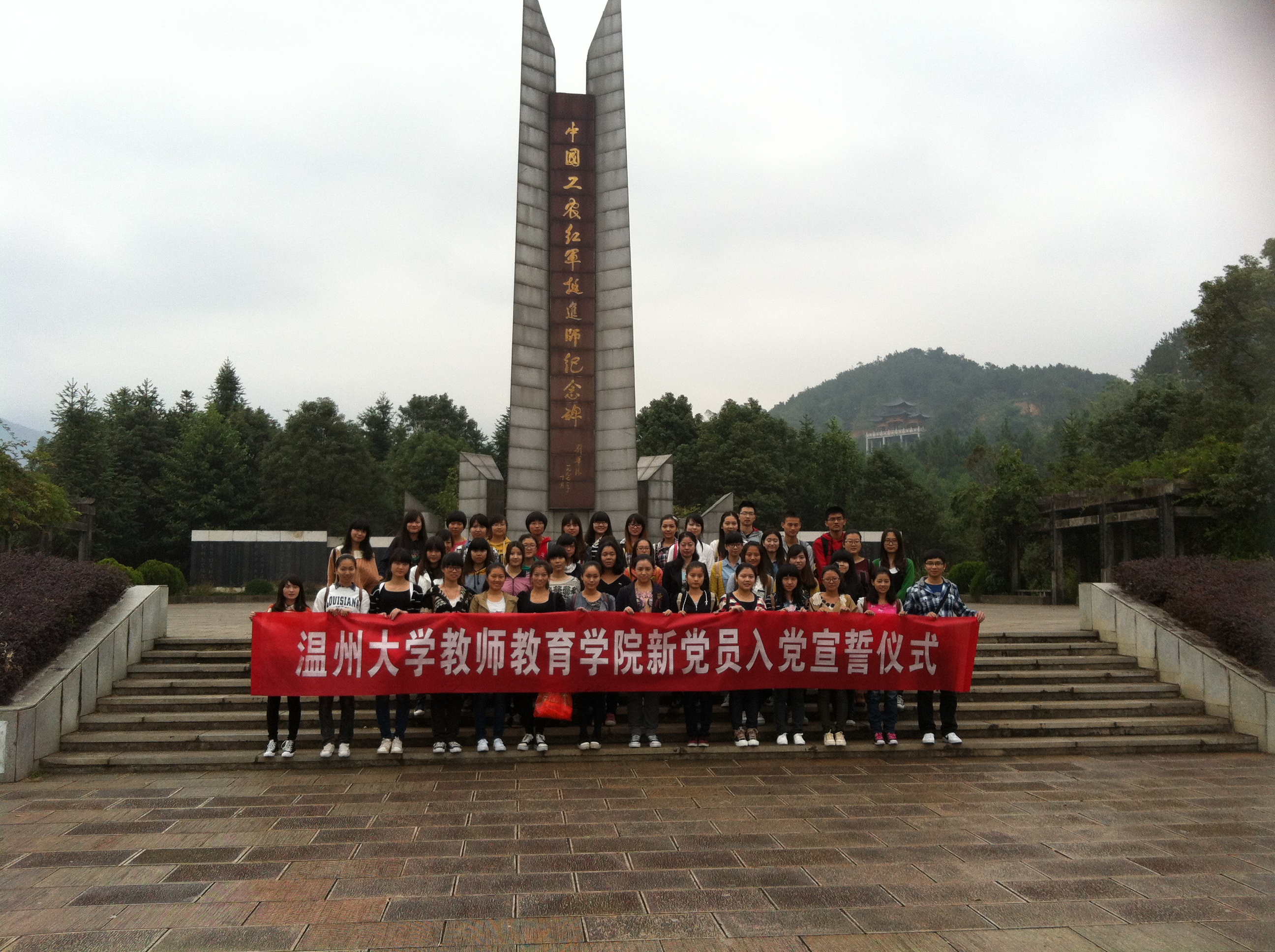 11月3日上午9点,我们一行人冒雨到达平阳县的中国工农红军挺进师纪念碑。在雄伟的纪念碑下,我们庄严地向烈士敬献鲜花,全体师生党员集体默哀1分钟以表达对烈士的哀思。接着,新党员在纪念碑下进行了入党宣誓仪式,老党员重温了入党誓词。尽管天公不作美,下着雨,但学生党员们巍然不动,庄重严肃地宣誓,表达出同学们对党的热爱之情。接着,全体党员学习了纪念碑碑文,同学们在了解革命战争时期先辈艰苦卓绝的奋斗历程中接受洗礼,实现精神升华。