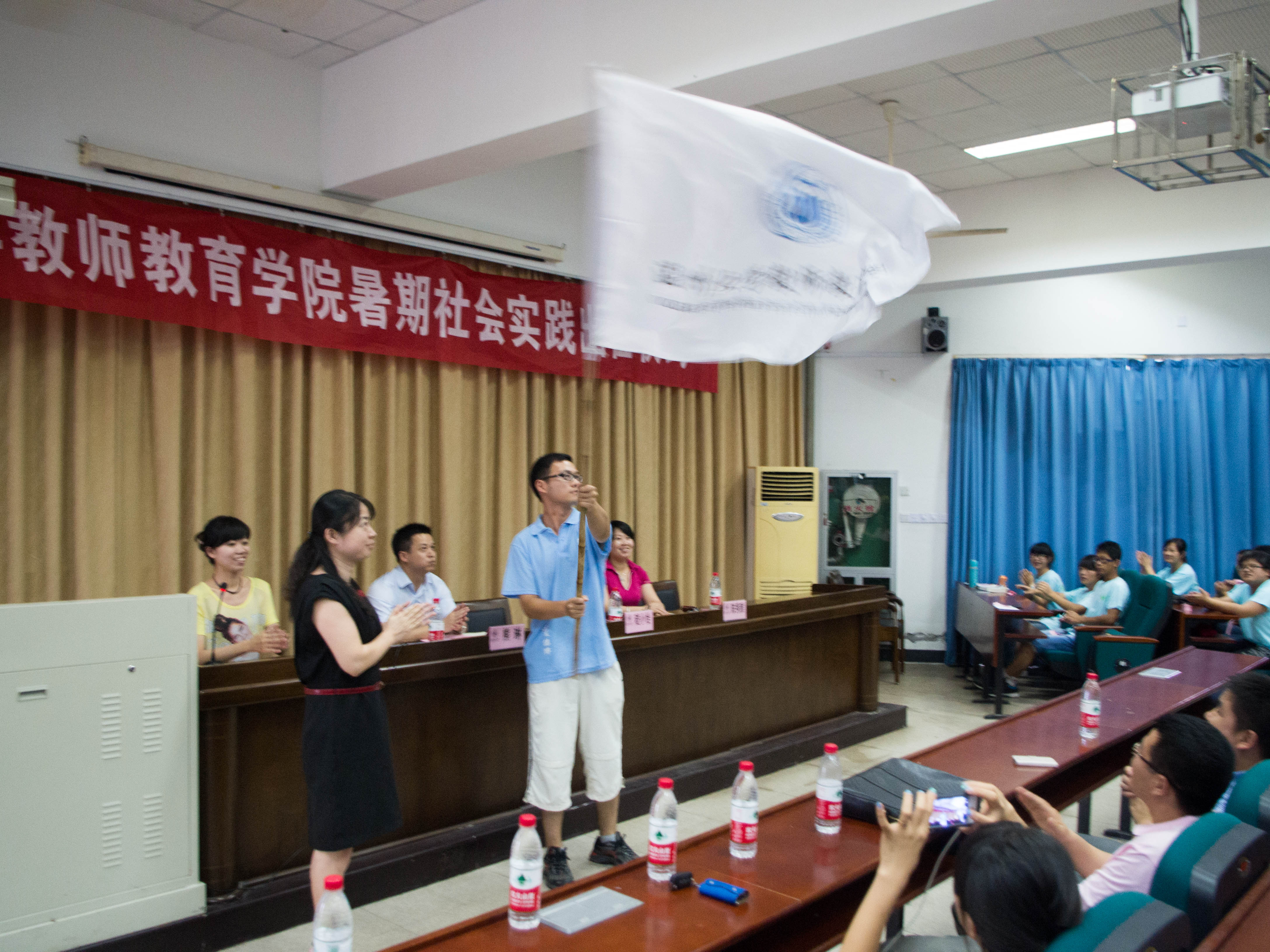 会上来自11应用心理学本的学生代表黄唯佳发言。她表示今年的暑期社会实践在形式和内容上都有所丰富,且每支队伍创新性地开展调研,做到理论和实际相结合。随后来自12小教科学的罗博文同学领誓,全体队员庄严宣誓,铿锵誓词饱含每一位队员的热情和信念。宣誓完毕,由学院党总支副书记嵇小怡为实践总队授旗。高高飘扬的实践队旗,昭示着泥巴影院