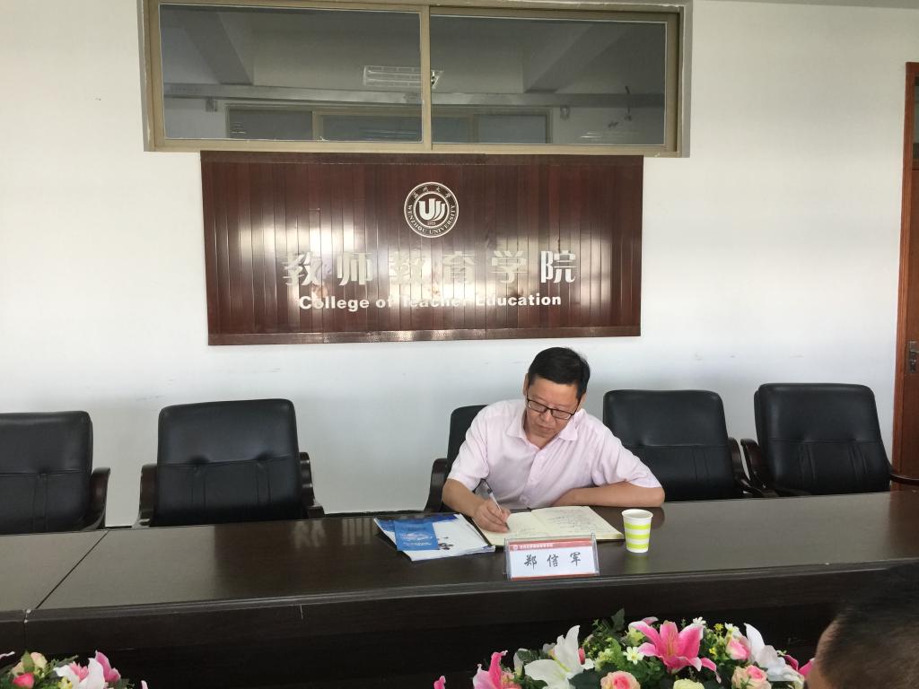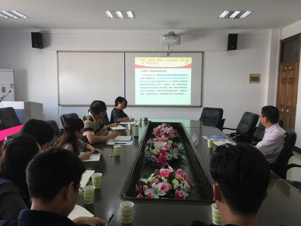 杨立淮书记代表学院向郑部长做工作汇报。他提到,学院党总支深入推进学院“两学一做”常态化制度化,抓常态、抓制度、抓落实,把思想政治教育摆在首位,理论学习分层分类,树立党的一切工作到支部的鲜明导向,“三会一课”规范化,党日活动和党员实践教育主题化。今年五月份学院党总支面向全体支部、党员和广大师生提出,在党员党性修养和支部建设中要自觉开展“三问三做”:要经常问问自己贯彻落实文件精神和理论学习是否到位,党员先锋模范作用发挥是否到位,履行工作职责是否到位,要做学习典范,做合格党员,做基层堡垒。以“三问”促“三做”,自觉将“'学'在日常,'做'在经常”落到对自身学习成果与作用发挥程度的日常检验中去。他还对目前存在的问题和下一步的工作打算做了阐述。杨丽君副书记就学生党建工作及存在的难点做了补充。
