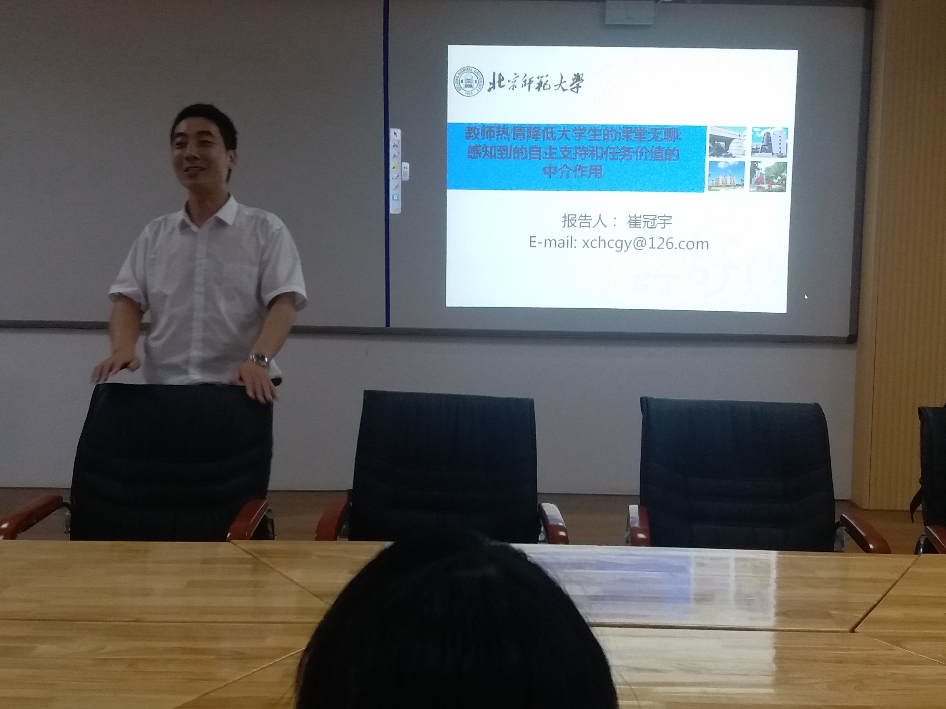 心理学系主任颜文靖博士首先致辞,欢迎崔博士及各位嘉宾的到来,并简单介绍了崔冠宇博士的基本信息。随后,崔博士根据参会本科生的需求,介绍了自己的求学、考研考博经历以及本研究的缘起,从而很好地激发了心理学系本科生考研的动机。接下来,崔博士介绍了教师热情在降低课堂无聊过程中重要作用及其机制,以及本研究所依据的相关理论,并对四个实证研究进行了详细的阐释,最后报告了该主题的主要研究结论。报告中崔博士还与参会人员就报告内容和进行了热烈、深入地探讨与交流。崔博士在报告中注重与参会人员的互动分享,鼓励学生谈自己的想法,这种轻松的学术研讨氛围让大家畅所欲言,相互启发,收获颇多。