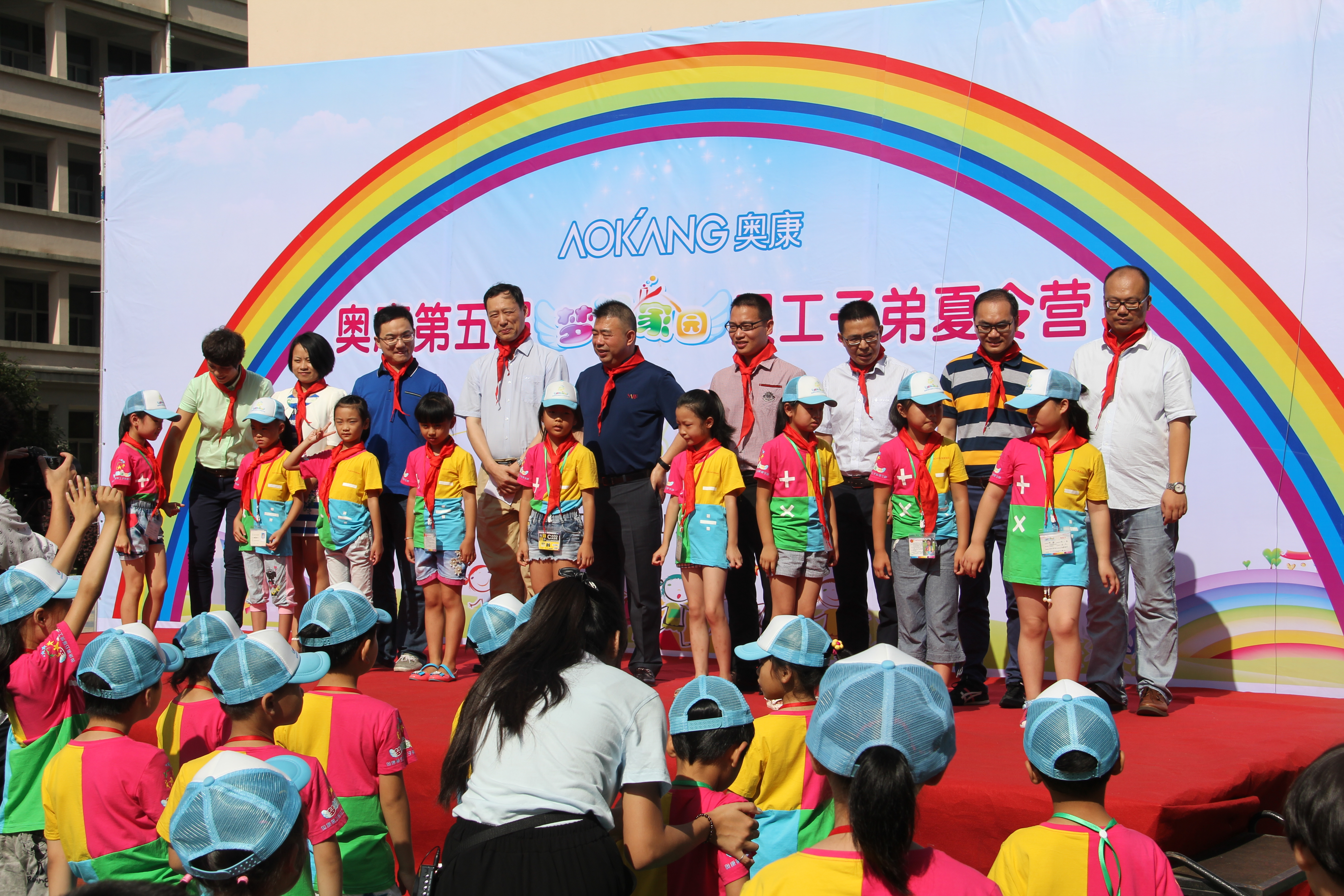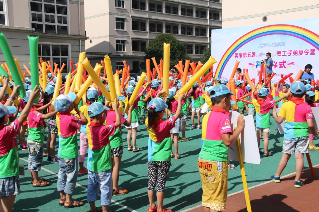 爱心支教联盟”的成立。随着奥康集团王振滔董事长宣布夏令营正式开始,开营仪式也逐渐来到了尾声。此时,会场上传来了小朋友热烈的掌声,他们手拿五彩缤纷的充气棒,红、橙、黄、绿、青、蓝、紫,远远望过去就好像是一道美丽的彩虹。