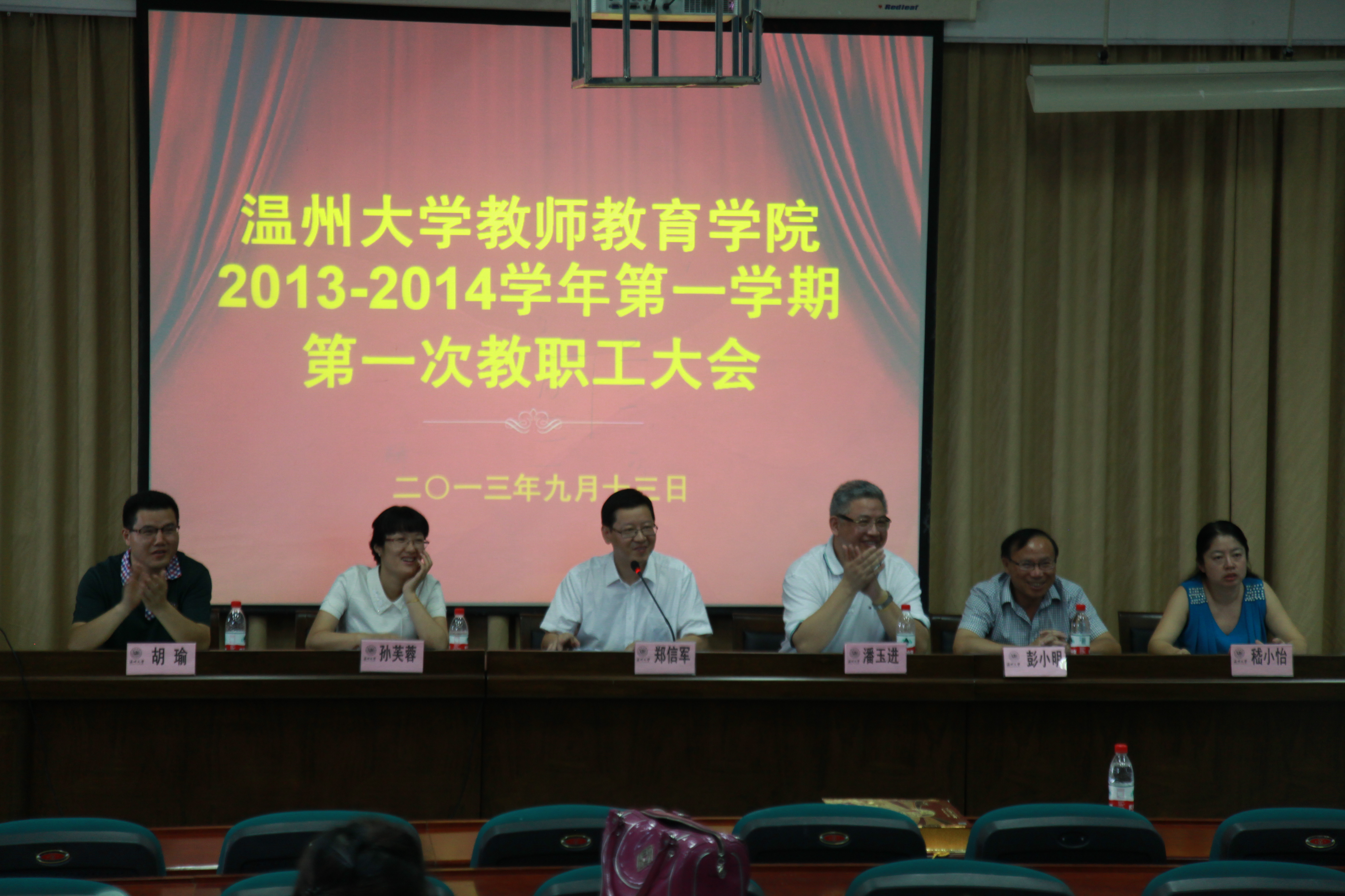 郑信军院长讲话,他向在暑期中坚持工作的老师们表示衷心的感谢,并向大家通报了学院2013届毕业生的就业数据及新生录取情况。