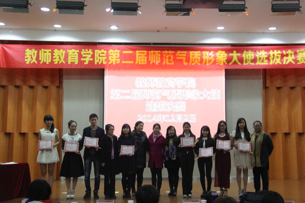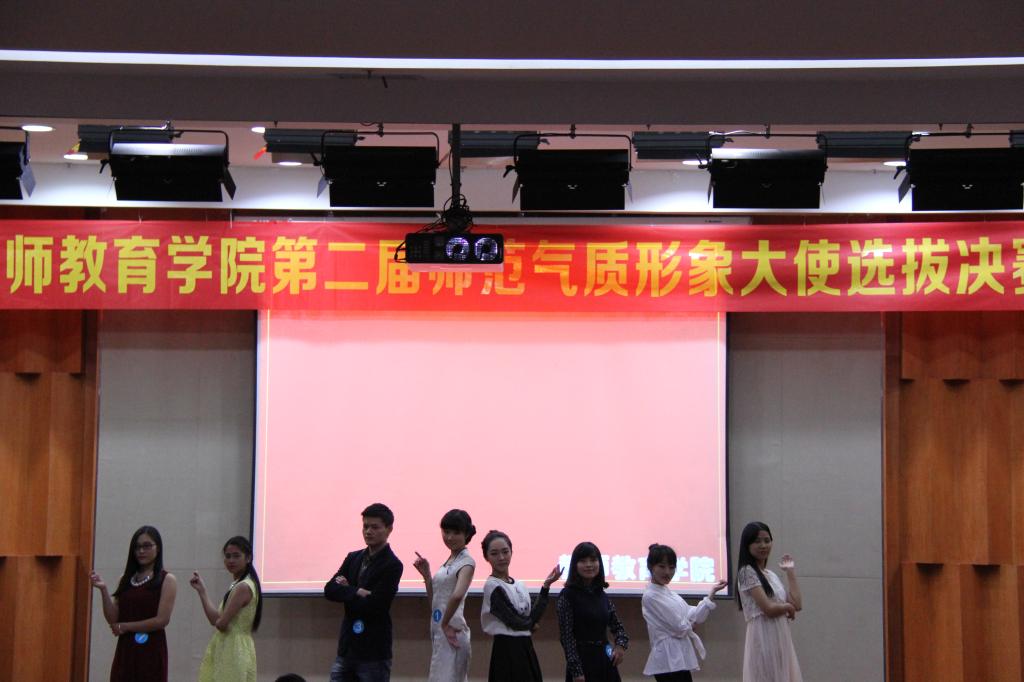 第二届师范气质形象大使选拔决赛在南校雁山厅举行。到场的嘉宾有学院党总支副书记嵇小怡老师,教技系主任张新立老师,小教系书记刘海霞老师,心理系卢佳老师,学前系杨利霞老师,以及来自泥巴影院