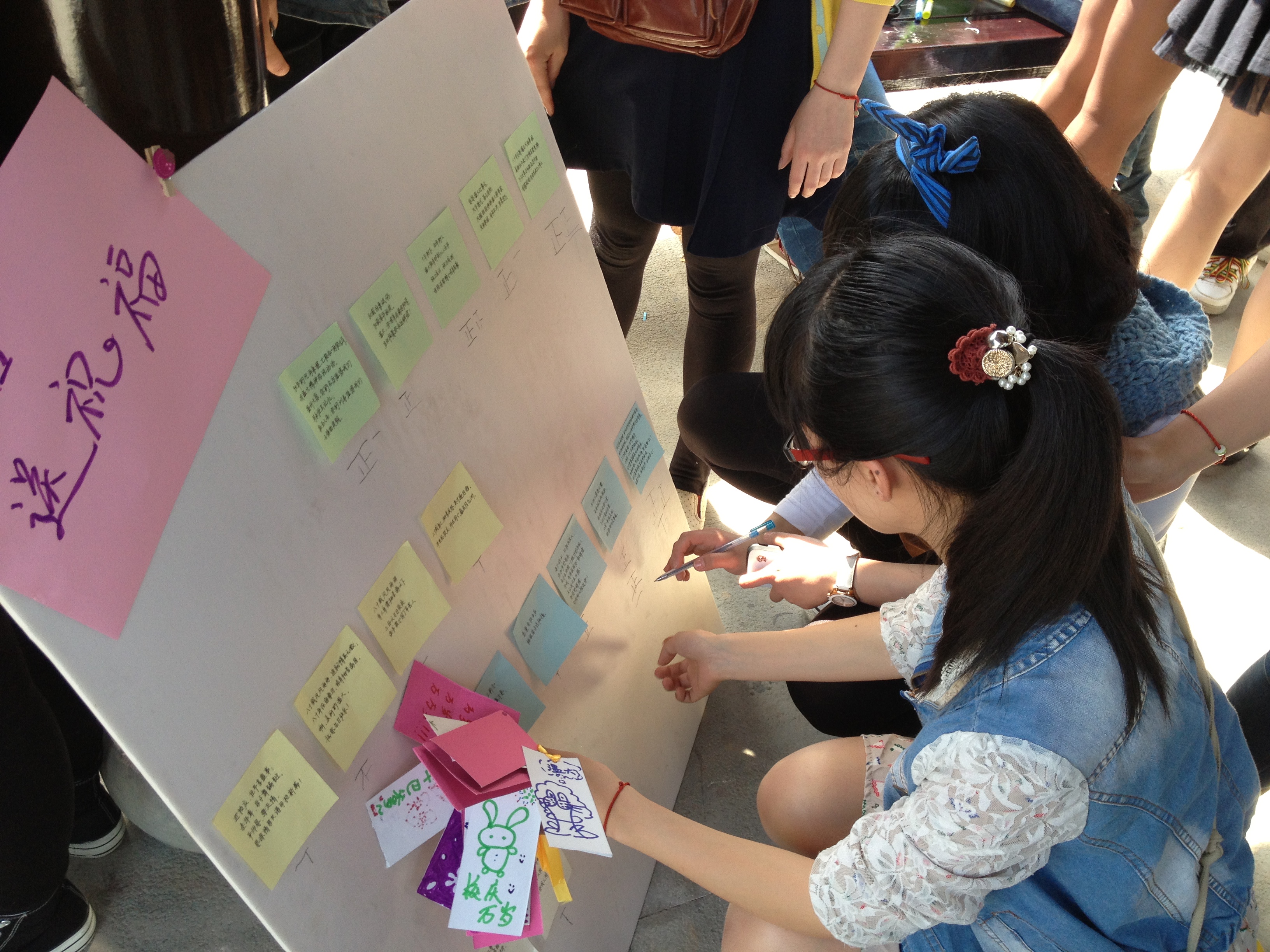 本次活动共分三块内容:制作校庆书签、短信送祝福评选、校庆知识竞赛。当天,溯初亭的柱子上,被一根根彩带串联,同学们把融入自己祝福的书签挂在彩带上,随风飘扬。期间,同学们还对征集的祝福短信进行评选,并开展校庆知识竞赛,在认识、了解学校历史、概况等基础上更好地迎接校庆,为校庆出一份力。