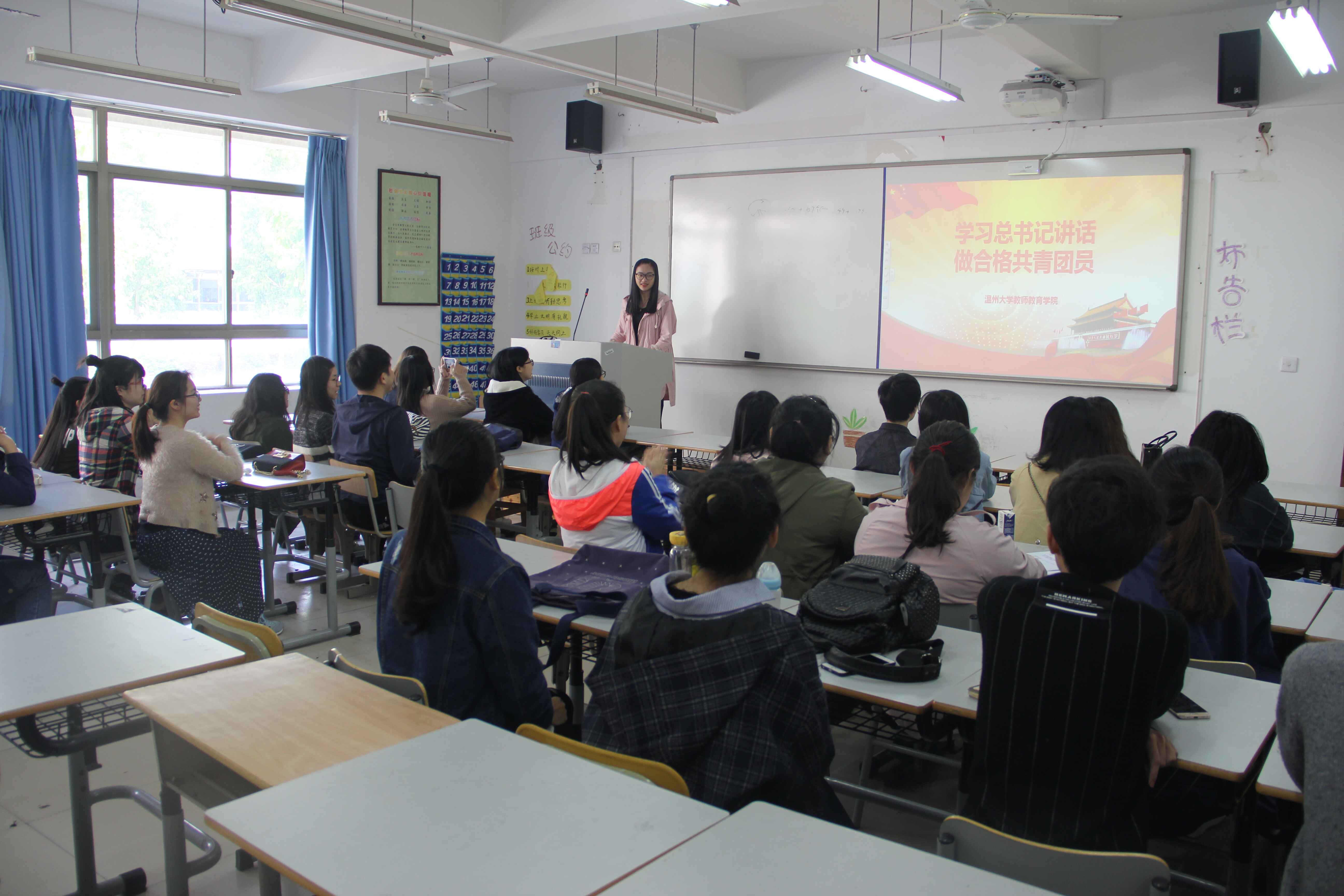 15心理学(师范)的班级里传来了洪亮有力的宣誓声,该班级正在开展“一学一做”系列活动。“这次入团宣誓的活动让我再次感受到了当年入团时的激动了心情,也让我更加明确了作为一名当代大学生的神圣使命和责任。”参加宣誓的倪微同学如是说。