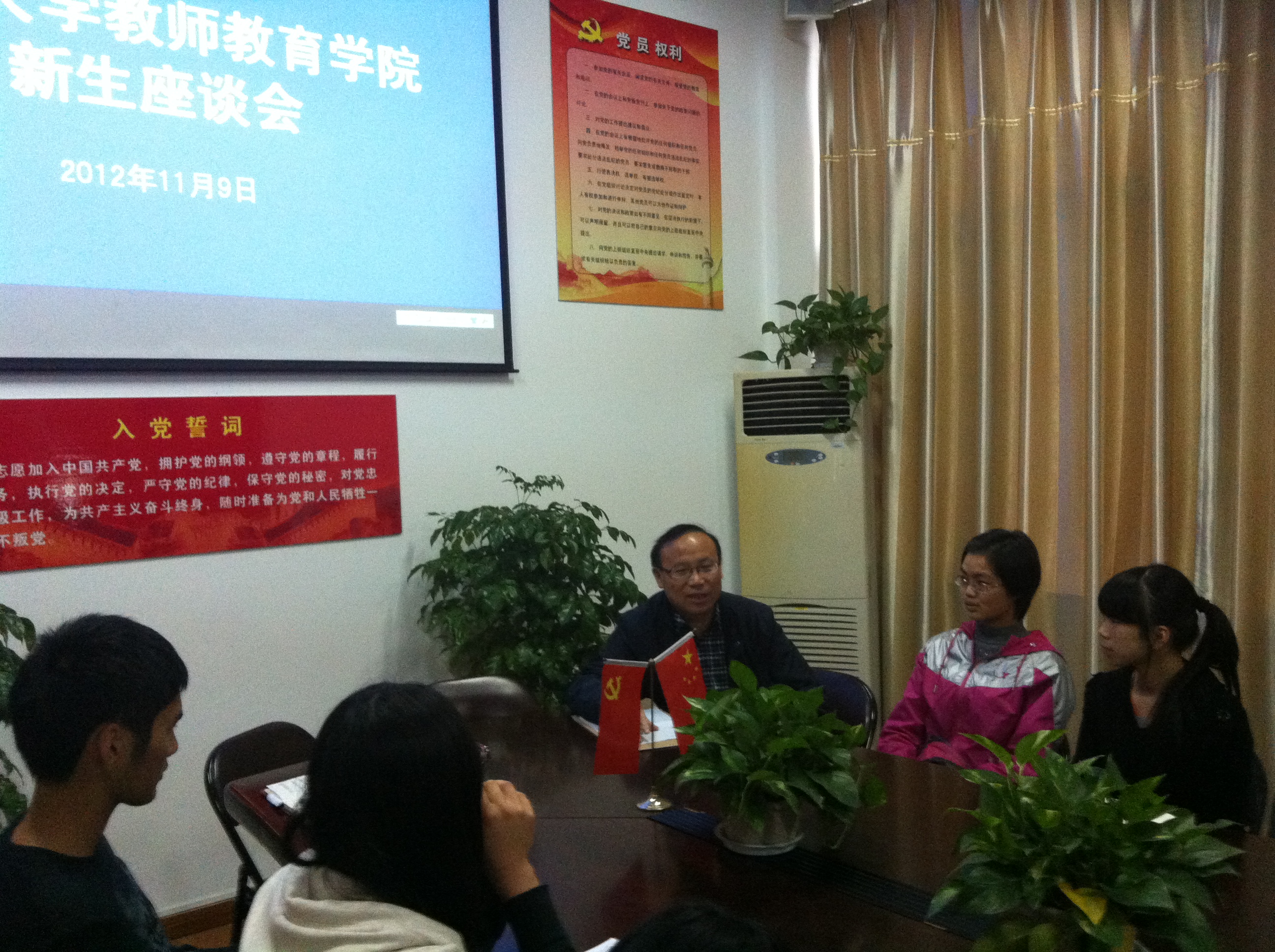 党员之家举行,彭小明副院长应邀出席会议。2012级新生入校已有2个多月的时间,同学们对于大学生活的适应情况是彭院长非常关心的问题,他认真听取了新生同学们所提出的大大小小共21个问题,有关小教专业分方向、后勤硬件设施、学区服务、学校体能测试、图书馆服务、早晚自习弹性管理、学习自主安排等问题,彭小明副院长针对这些问题给予了一一解答。他还与同学们分享了三点体会:1、学习知识要与增长才干相结合;2、学会学习要与学会做人相结合;3、结果与过程相结合。他希望同学们好好利用大学四年“写好自己的历史”,新生同学们受益匪浅。