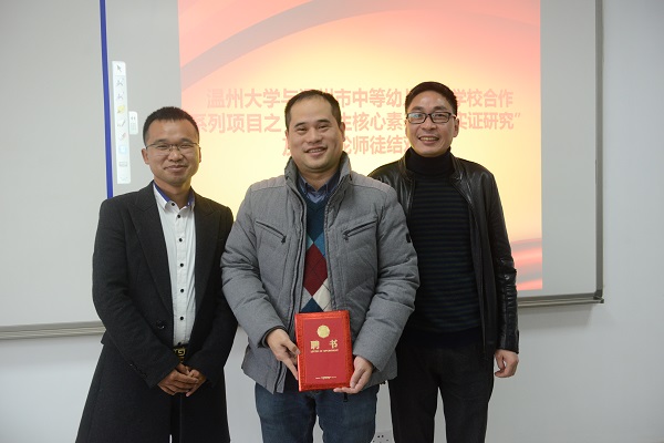 会议期间,“幼师生核心素养培育实证研究”课题组总负责人彭小明教授作专题讲座,内容由提出背景、概念界定、基本特点、构成要素、培养策略、重要意义等整体设计与学科“核心素养”两大部分组成。其中学科“核心素养”分思想品德、语言、社会、科学、健康、艺术核心素养。彭教授以语文核心素养为案例,指导课题组成员如何做好学科“核心素养”的培养。另外泥巴影院 与温州市中等幼儿师范学校开展第三轮课程系列的师徒结对,这次结对有区角游戏、基础教育学、乐理视唱练耳三学科课程。温幼师蒋高烈校长与戚强建副校长分别为课题组与学科课程组导师颁发聘书并合影留念。最后,彭小明教授对课题组和课程组成员提出要求以及分段完成项目内容的时间安排。