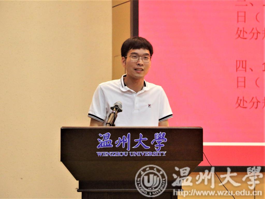 会议伊始,由何奔奔老师通报上一学年至今的违纪处分情况,宣读违纪处分条例。同时,他以实例告诫同学们诚实守信,严守考风考纪,并预祝全体同学能够在期末考试中发挥出色,有所收获。随后,为营造诚信考试的良好氛围,做好诚信应考动员工作,优秀学生代表许列萍同学上台领誓诚信考试宣言。会议的最后,学院党委副书记彭小媚作总结讲话。在讲话中,彭书记强调,诚信是做人最基本的底线,同学们应坚守住底线,诚信应考。“考试不仅是对同学们知识的检验,更是对同学们品性的检验。”她如是说道。同时,她也希望各位同学能够静下心来好好复习,做好充分准备迎接期末考试,最终取得理想的成绩。听取了彭书记的总结讲话,同学们深切感受到了学院领导的鞭策与鼓励,诚信考试的准则定将内化于心,外化于行。