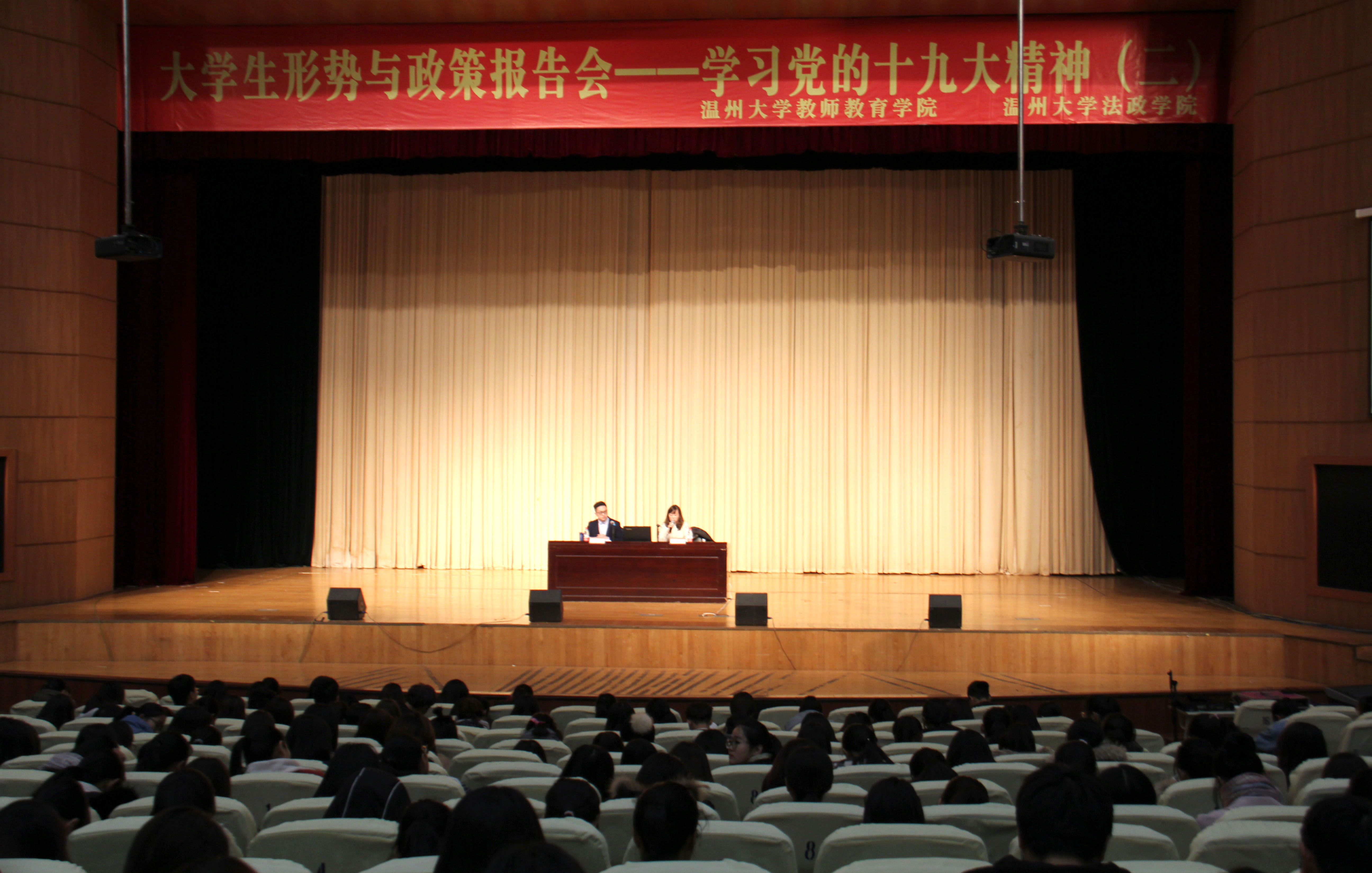 为了响应十九大精神,营造更好的法治教育环境和氛围,近期,泥巴影院 教师泥巴影院 与泥巴影院 法政学院在育英大礼堂联合举行“大学生形势与政策报告会——学习党的十九大精神”主题报告会。十九大报告中,习近平总书记用“民主法治建设迈出重大步伐”这12个字,概况了这极不平凡的5年,我国推进全面依法治国取得的历史性成就。此次讲座由教师泥巴影院 党总支副书记杨丽君主持,并且特别邀请到来自浙江人民联合律师事务所的项若非为同学解读十九大中的法律知识。