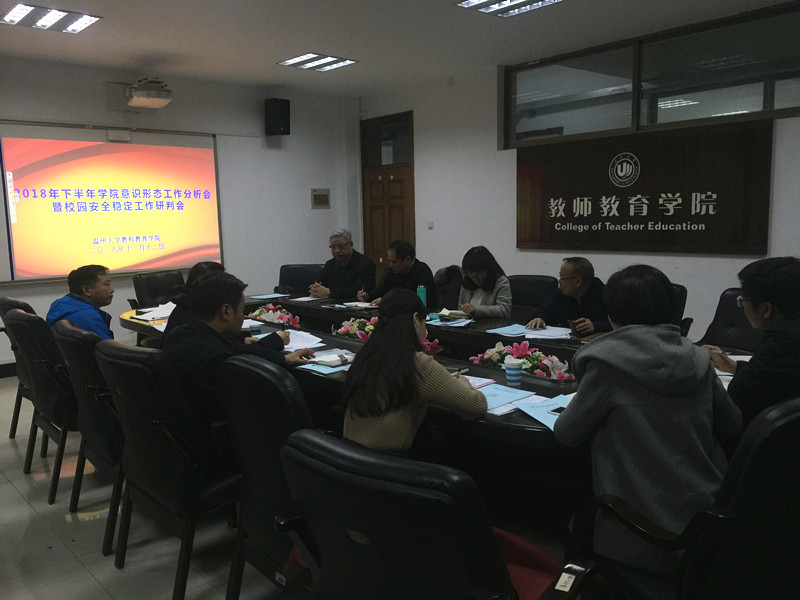 为深入贯彻中央、省委及学校部署要求,泥巴影院 于12月12日下午在9A410召开2018年下半年高校安全稳定隐患排查化解和校园意识形态领域分析研判工作会议,学院党政班子成员、跟岗院长、各科室负责人参加会议,杨立淮书记主持会议。